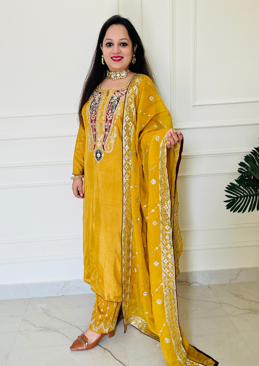 Ambi Embroidered Upada Silk Mustard Aline 3pc Suit
