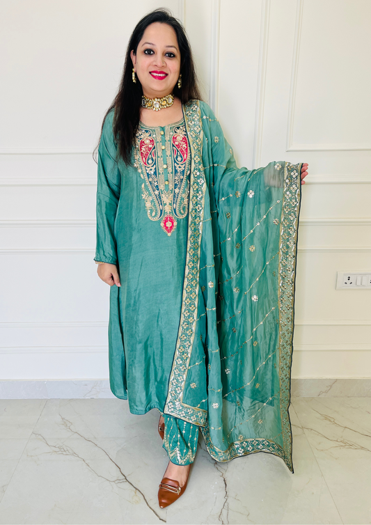 Ambi Embroidered Upada Silk Green Aline 3pc Suit