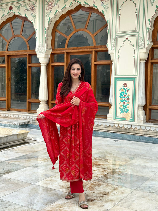 Bandhani Print Premium Modal Suit Set-Red Colour