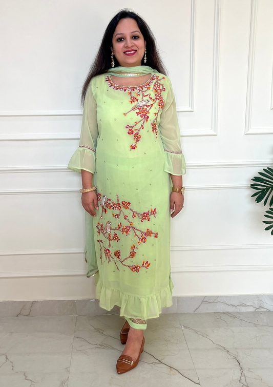 Georgette based Bird Daali Hand Embroidered 3pc suit in Green Colour