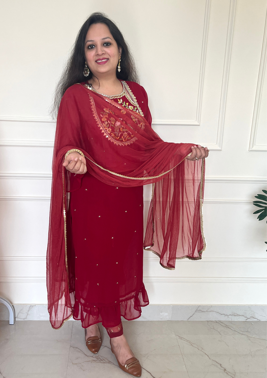 Georgette based Bird Hand Embroidered 3pc suit in Maroon