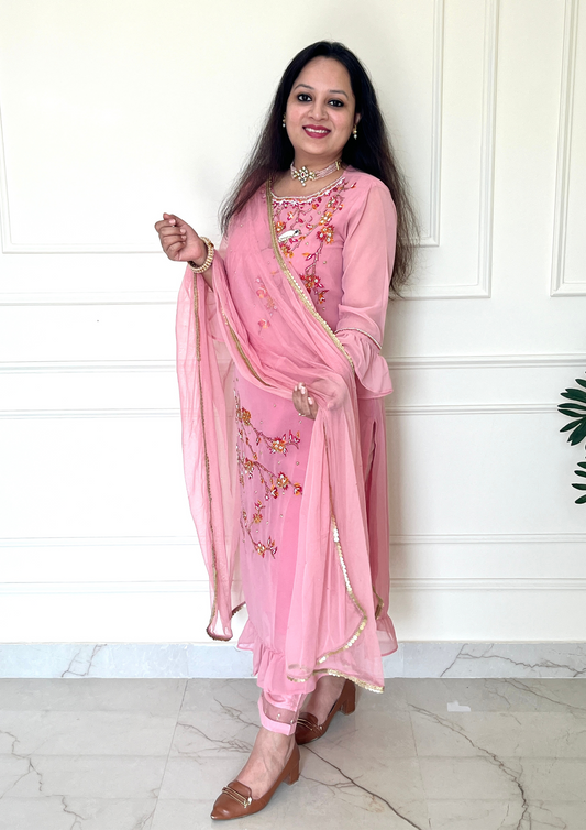 Georgette based Bird Daali Hand Embroidered 3pc suit in Blush Pink Colour