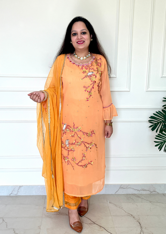 Georgette based Bird Daali Hand Embroidered 3pc suit in Peach Colour
