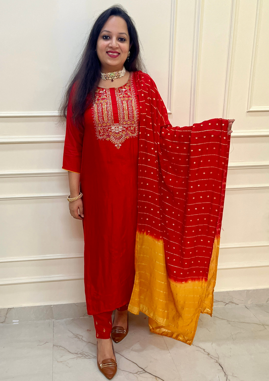 Hand Embroiery Dola Silk Red Colour 3pc Suit
