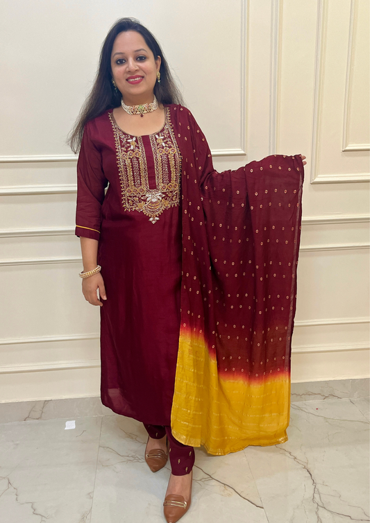 Hand Embroiery Dola Silk Maroon Colour 3pc Suit