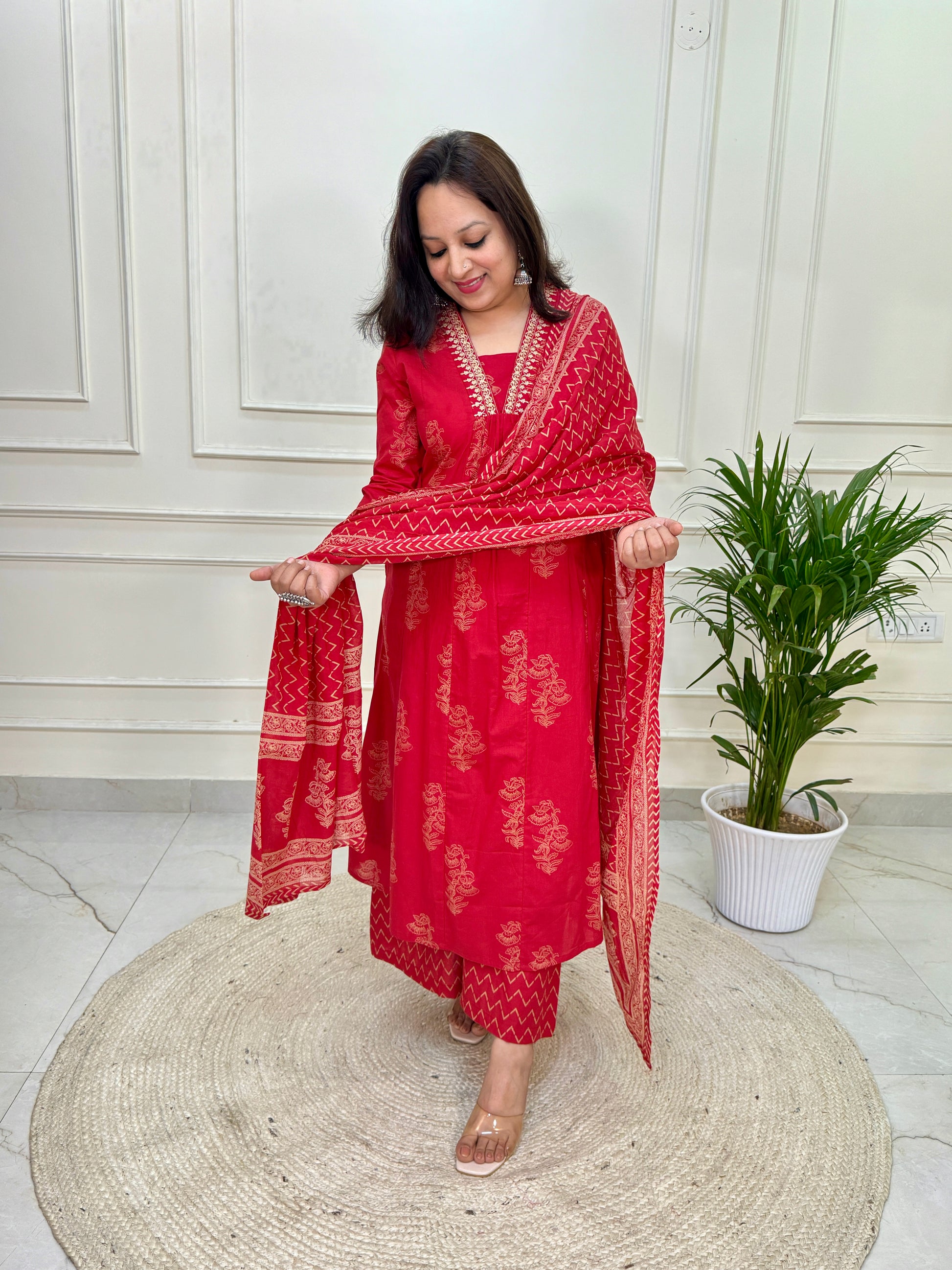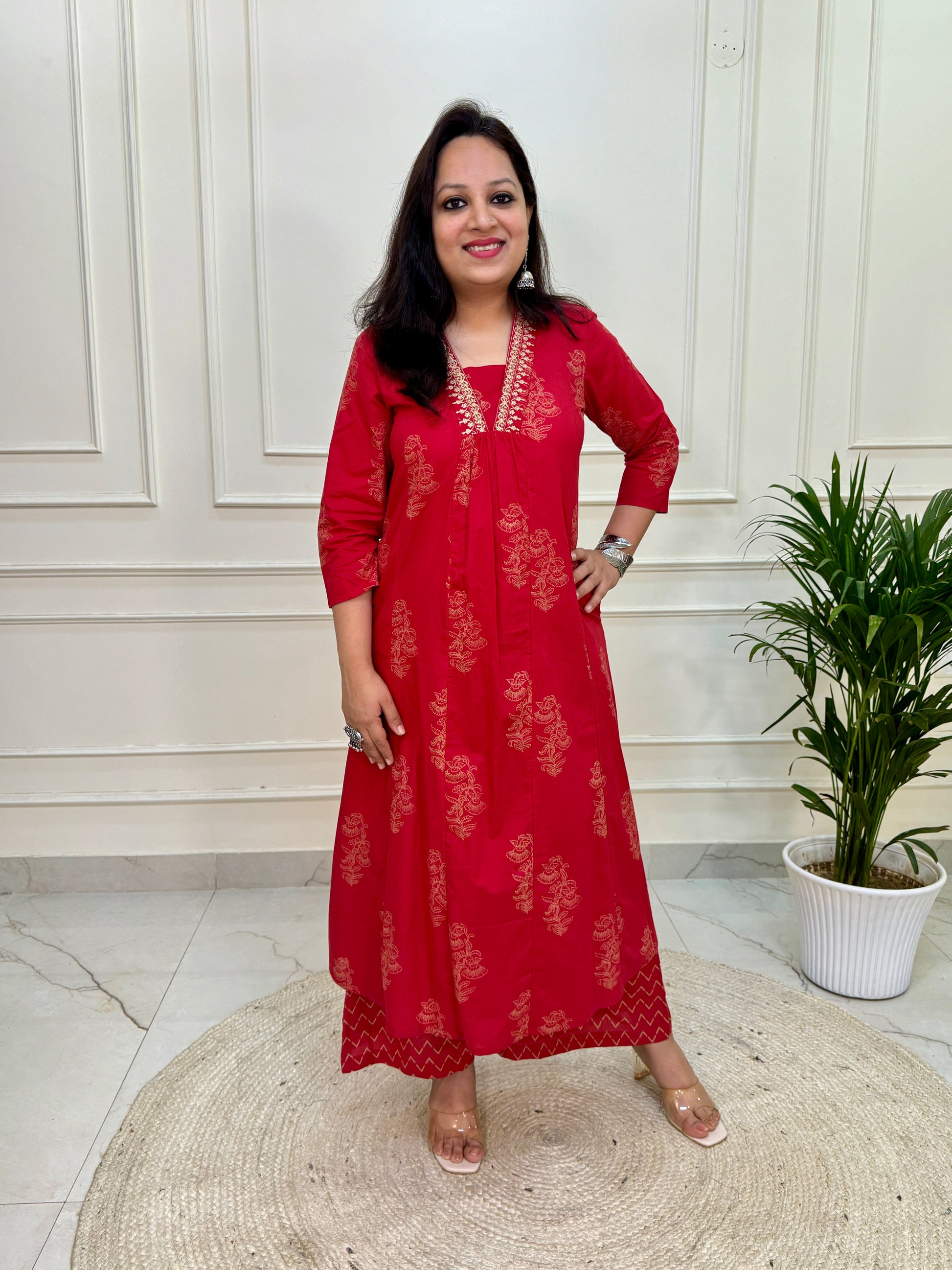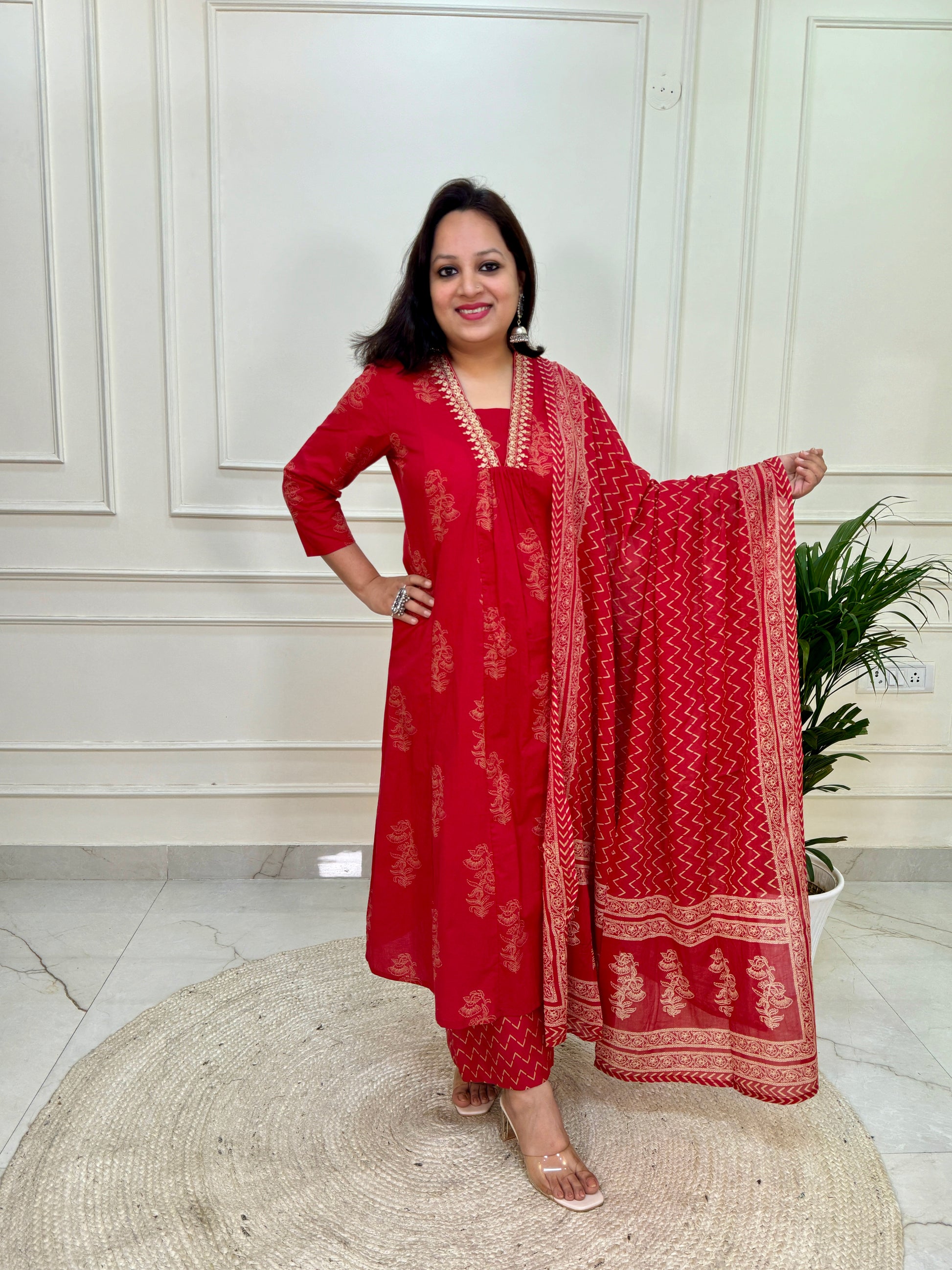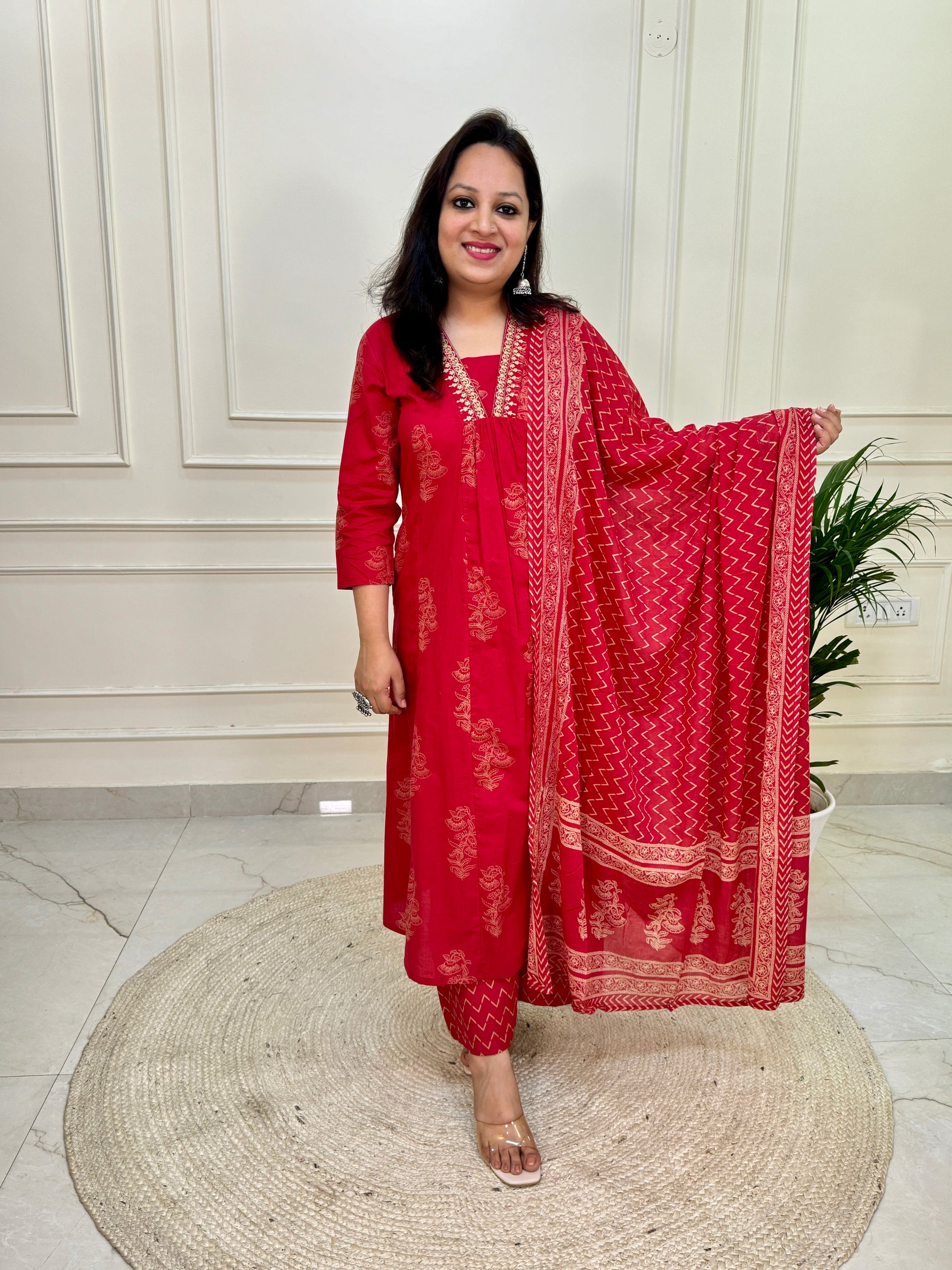 Exquisite Red Aline suit set in Khadi Print in pure cotton fabric in with mul dup & flared palazzo.