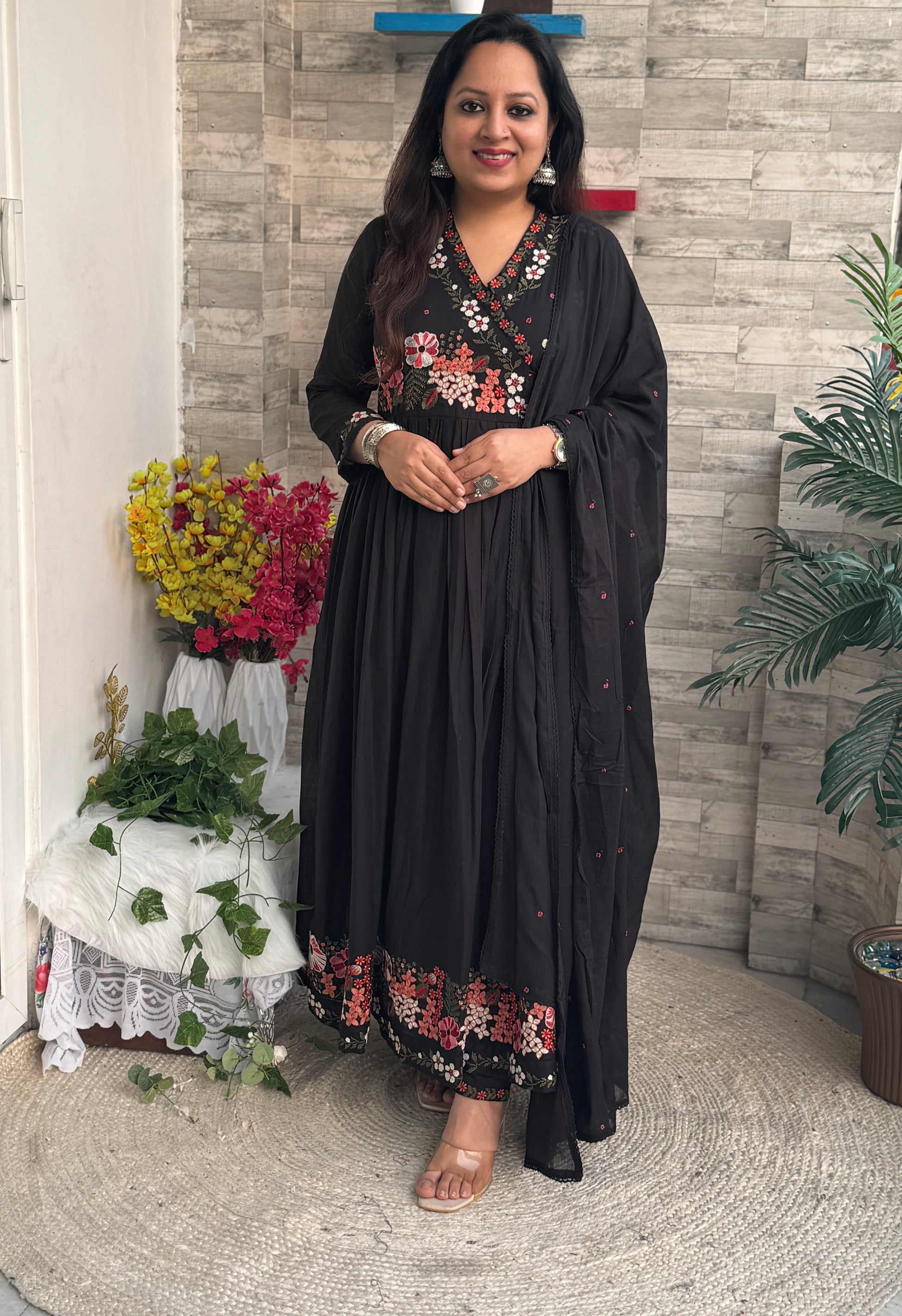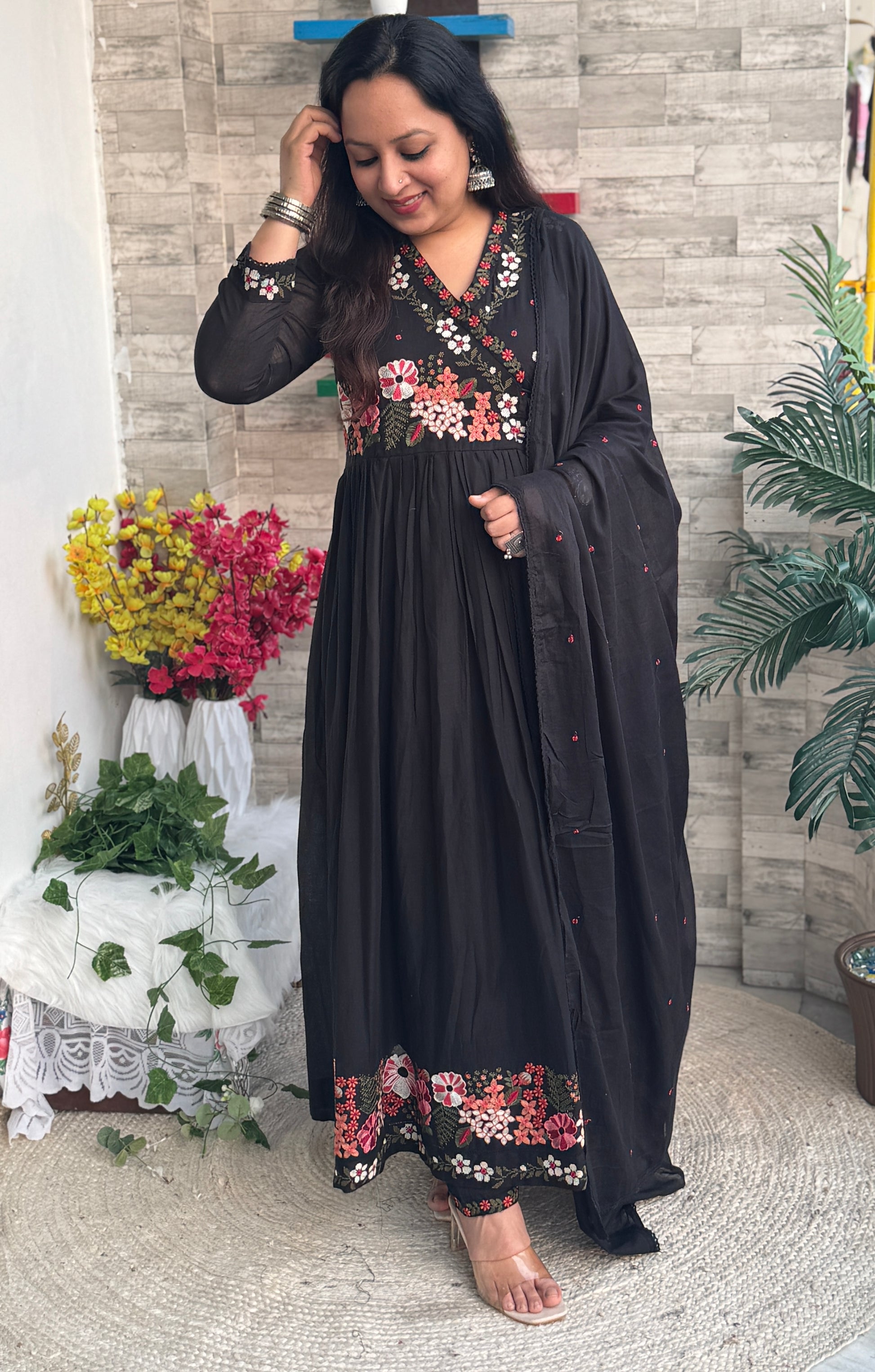 Black mul cotton embroidered anarkali Kurta set with thread embroidery on the yoke of the kurta. The pants are plain with trouser fit and the dupatta is printed in mul cotton fabric. The sleeves are 3/4th.