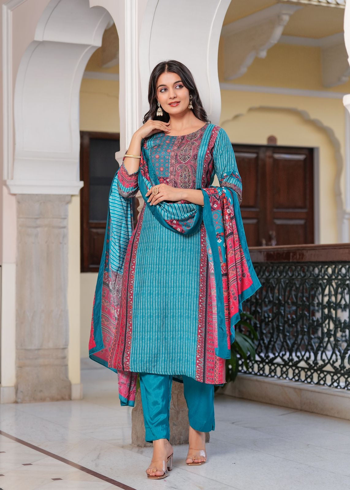 Palazzo Digital Print Crepe Suit Set- Teal
