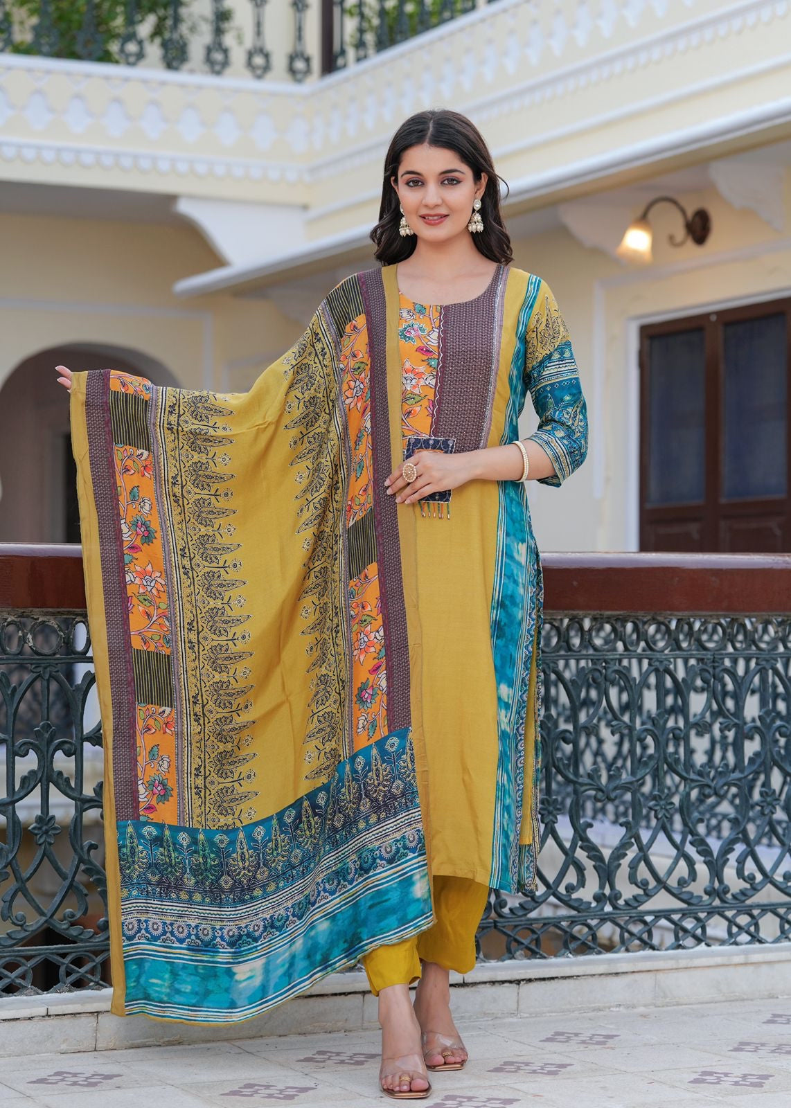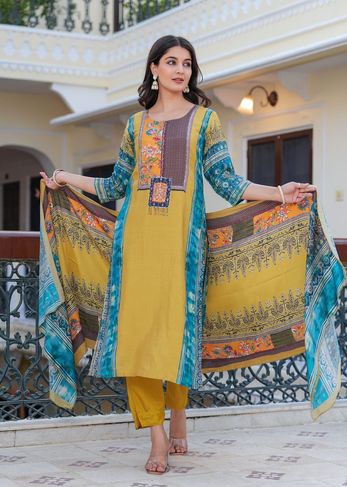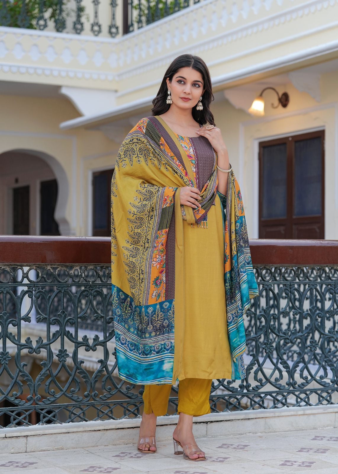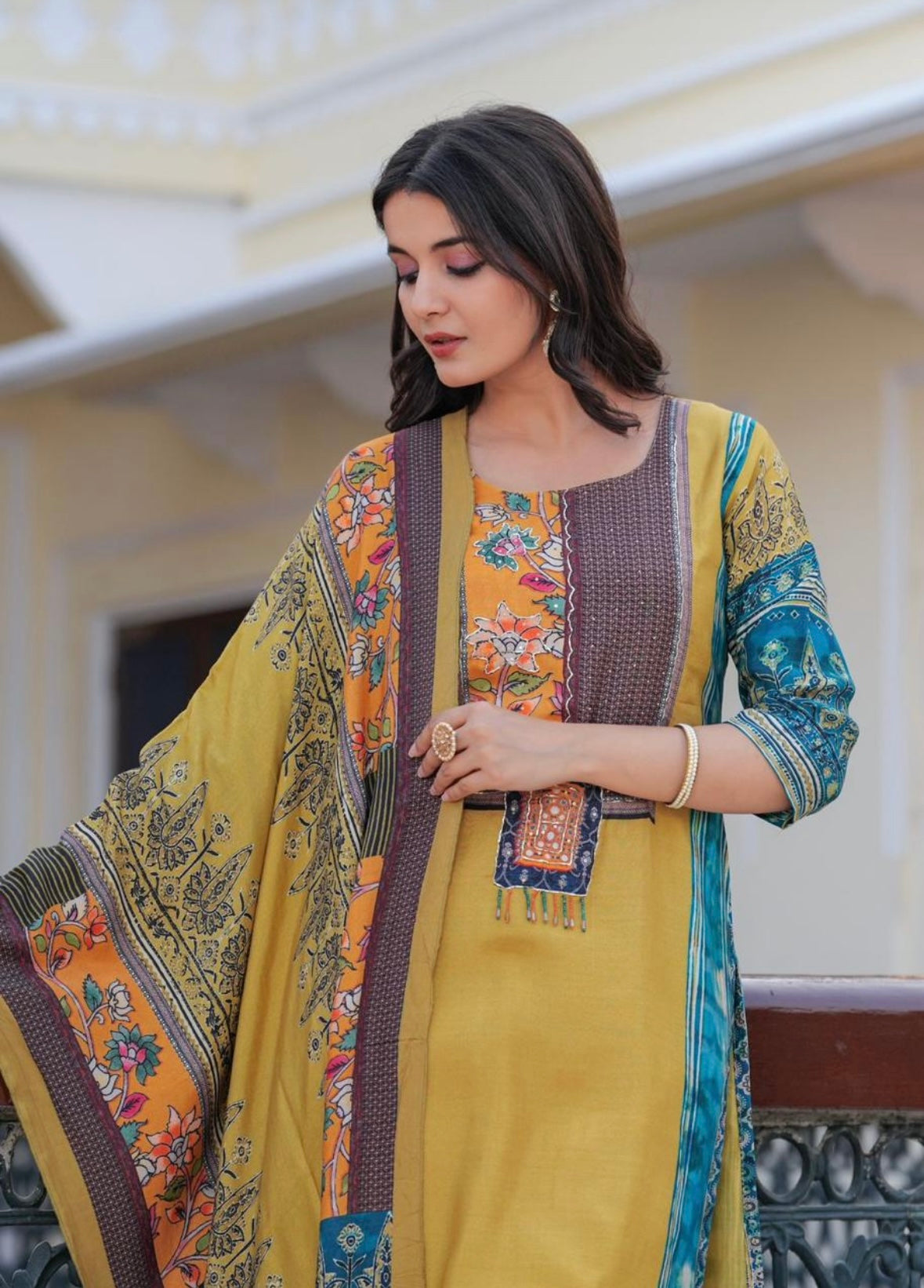 Hand Embroiery Dola Silk Mustard Colour 3pc Suit