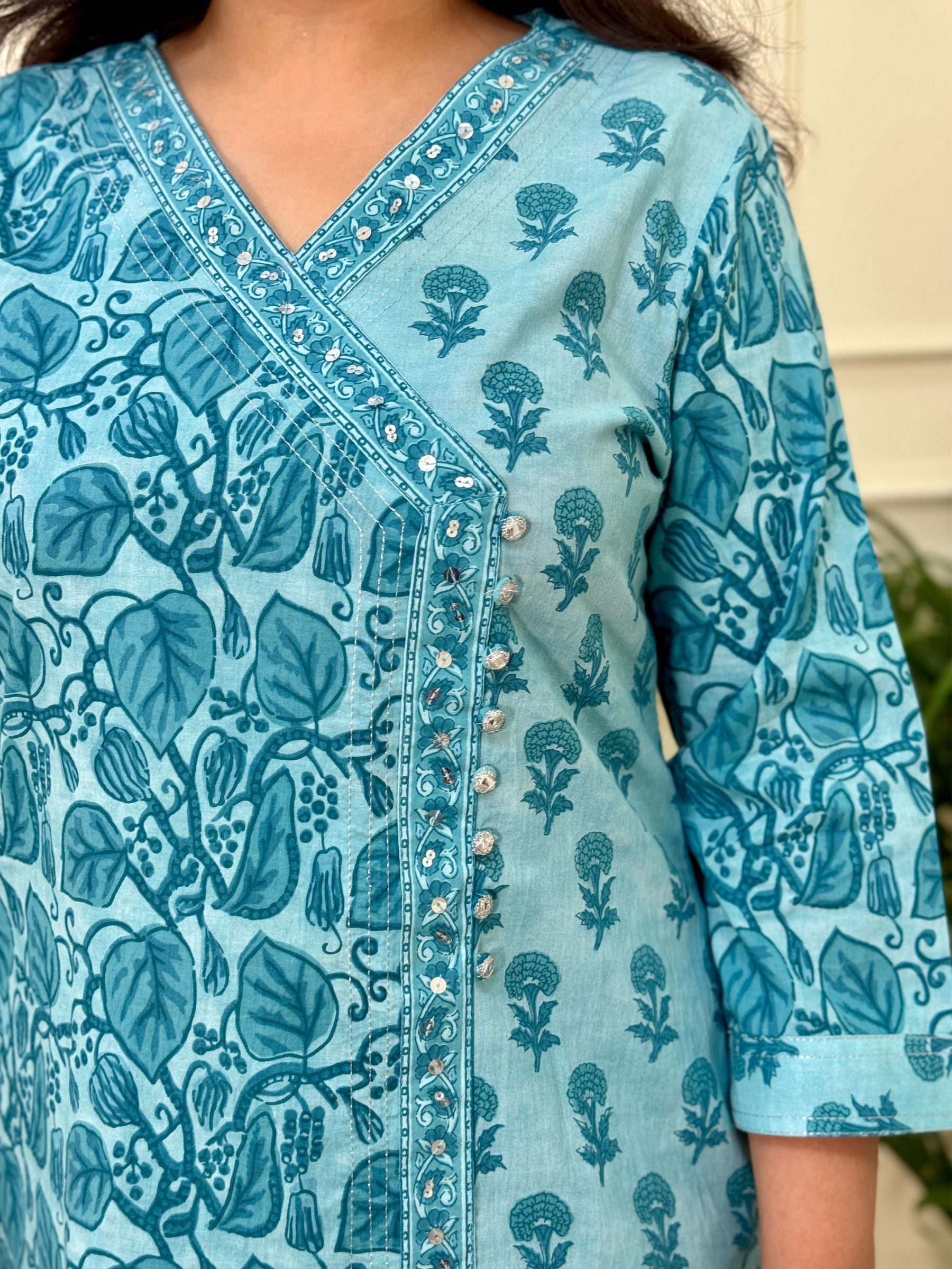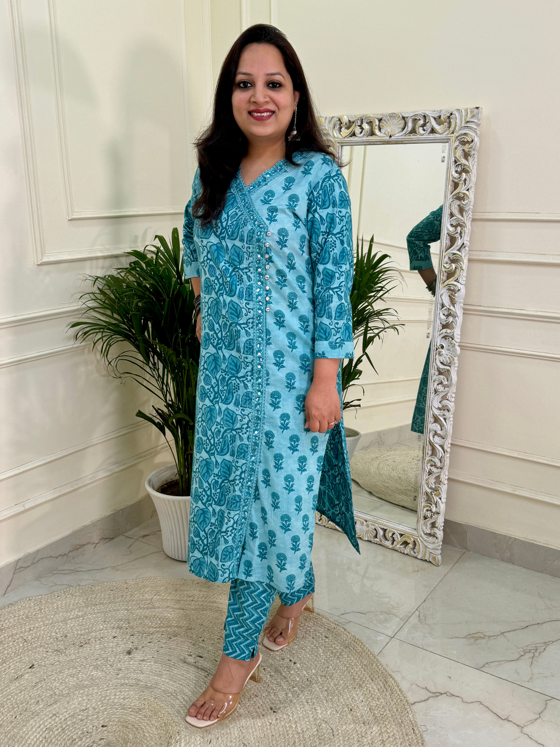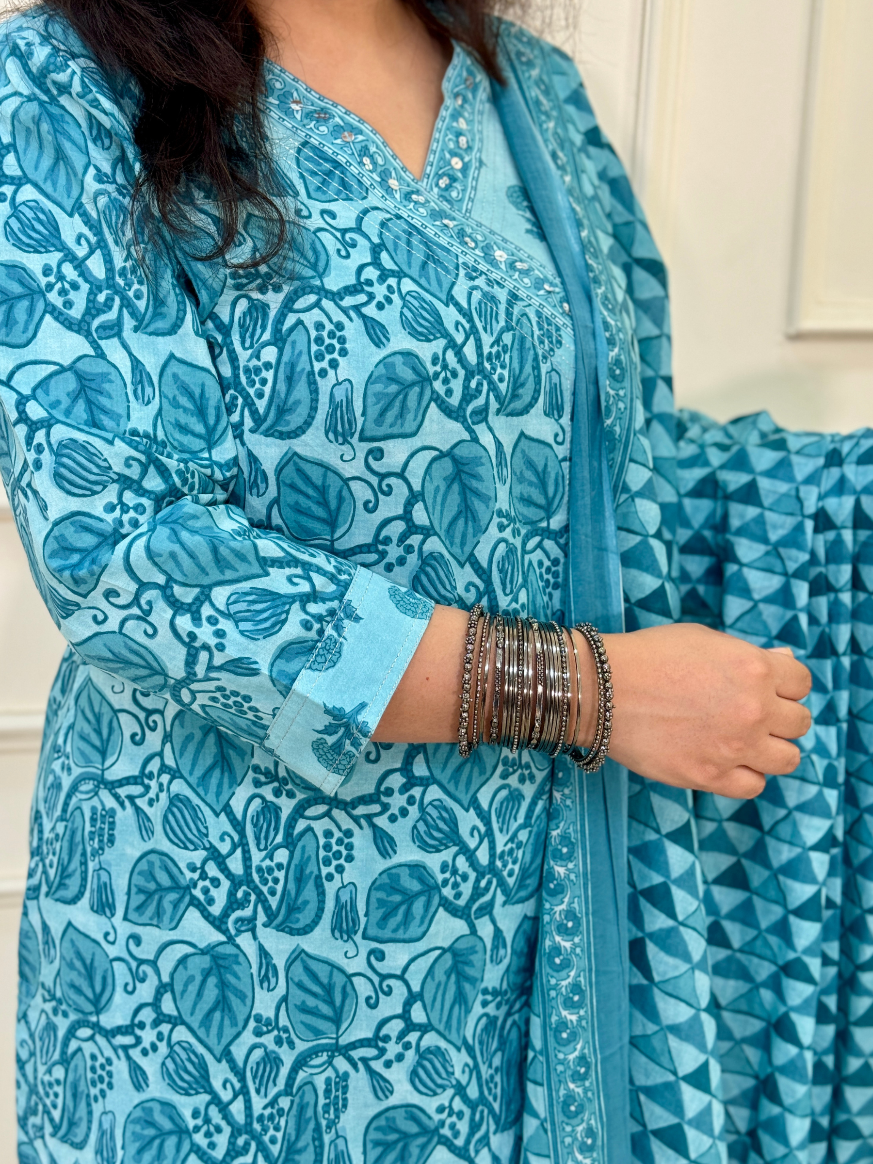 Angrakha Pattern A line Daabu Print Suit set-Blue colour
