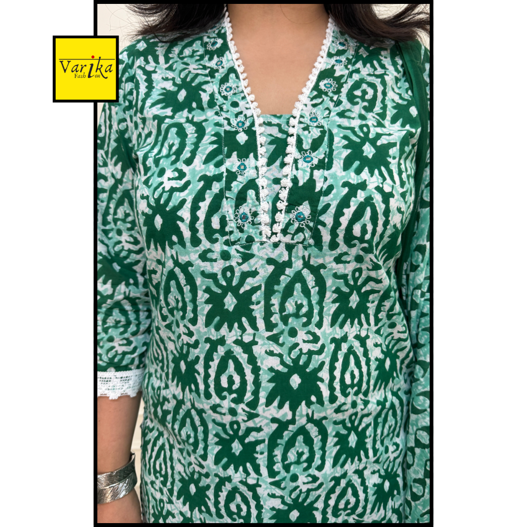 Baatik Print Green Colour Jaipuri printed Kurta set with light embroidery on the neck of the kurta. The pants are printed in straight fit and the dupatta is printed in mul cotton fabric.