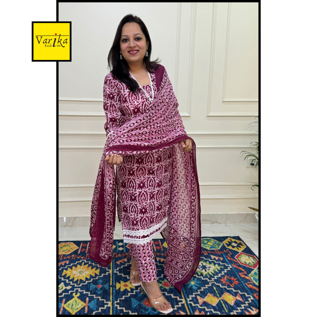 Baatik Print Maroon Colour Jaipuri printed Kurta set with light embroidery on the neck of the kurta. The pants are printed in straight fit and the dupatta is printed in mul cotton fabric.