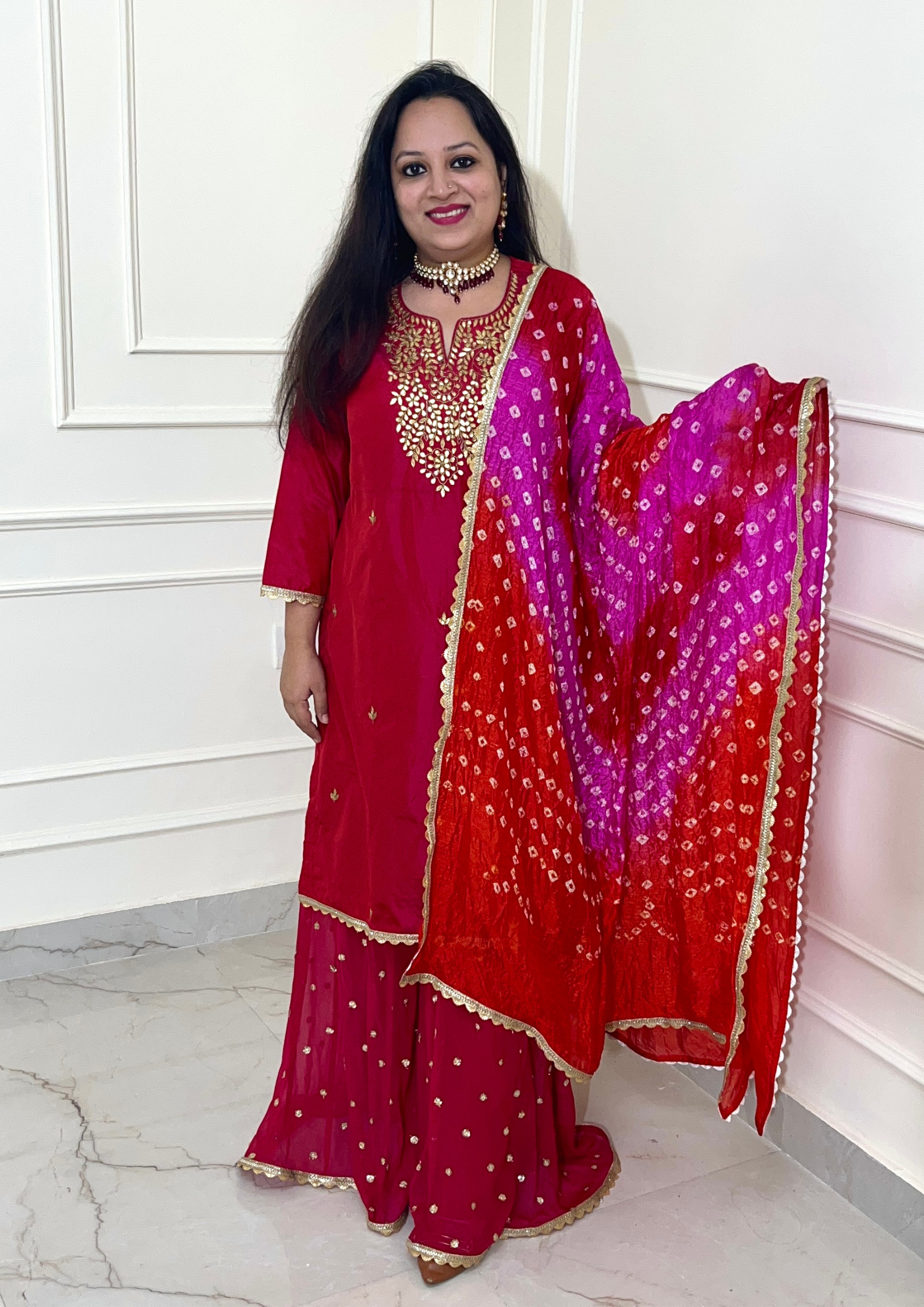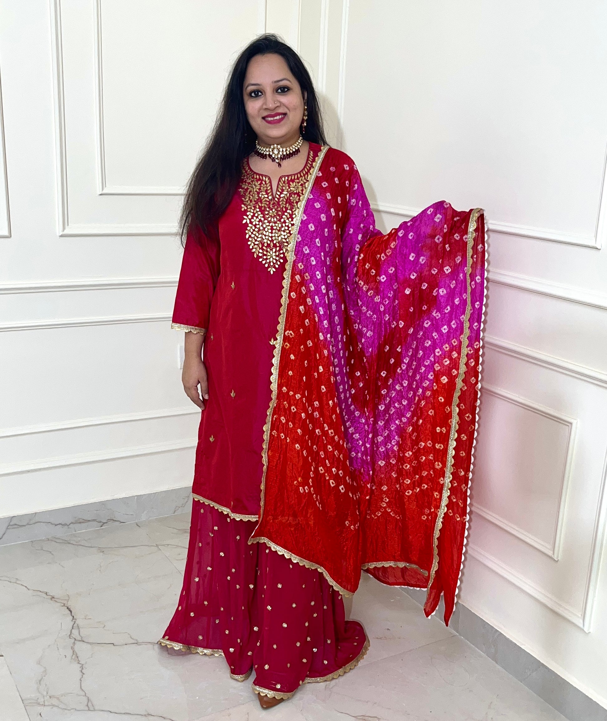 Beautiful art silk kurta with intricate gota patti embroidery teamed with a georgette sequins buta divider Kalidar Sharara with beautiful tassels. The suit is teamed with a beautiful silk bandhani multicolour dupatta with lace trims.