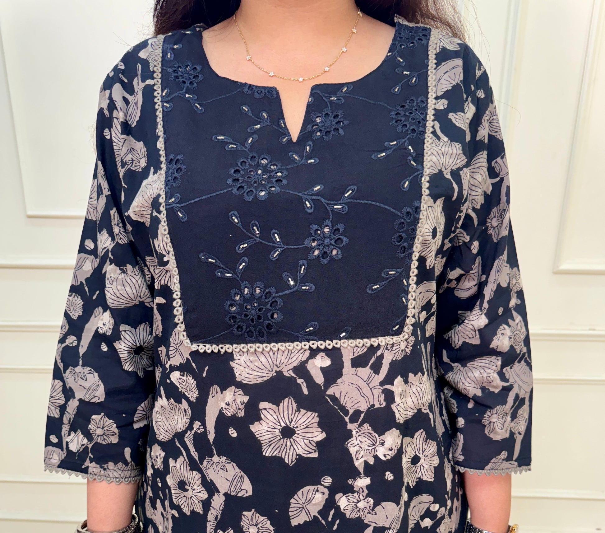 Black Block Print Jaipuri printed Kurta set with light embroidery on the neck of the kurta.