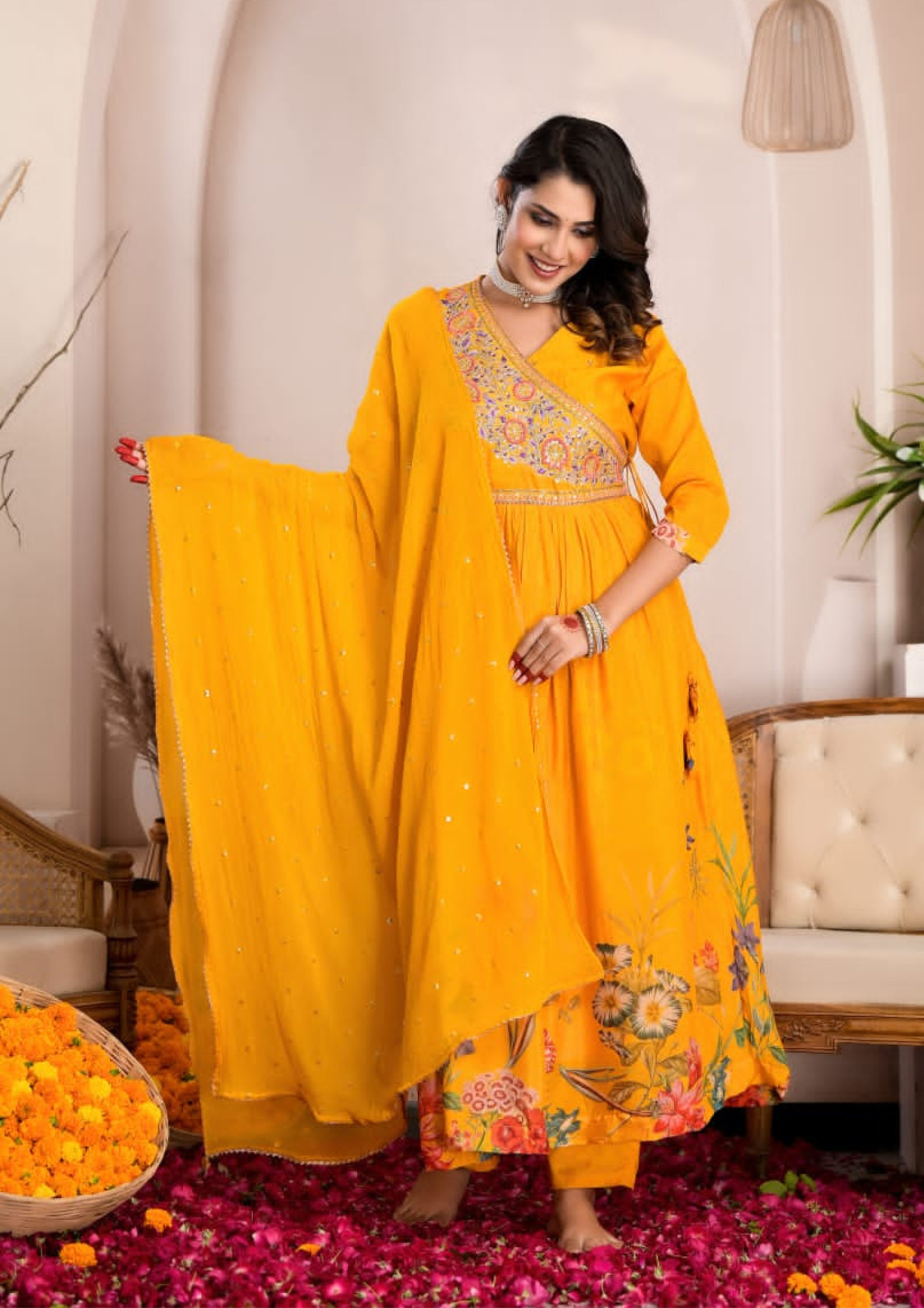 Beautiful digital floral print 3 piece suit set teamed with a beautiful dupatta and pants. The kurta has intricate hand embroidery on the yoke.