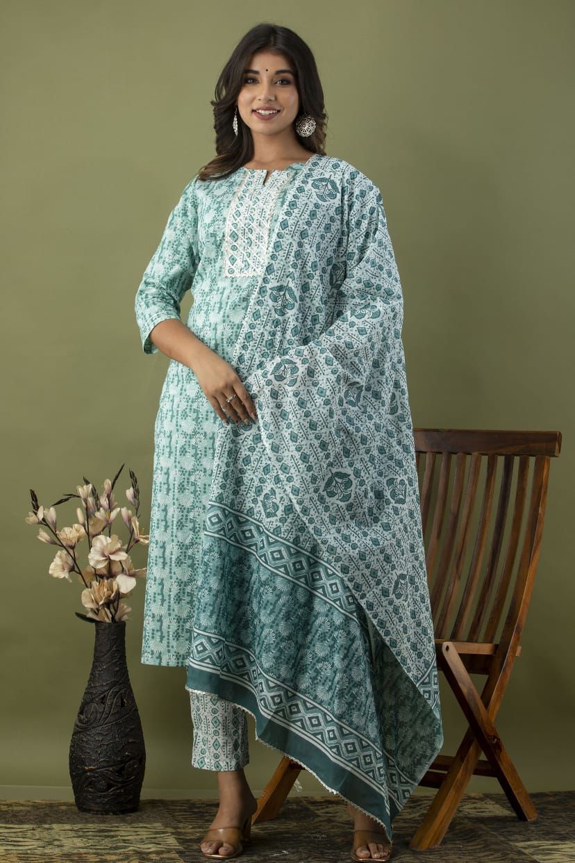 Teal Green Colour beautiful 3 pc pure cotton suit set. The kurta yoke has light gota work and its teamed up with a printed pants and printed cotton dupatta.