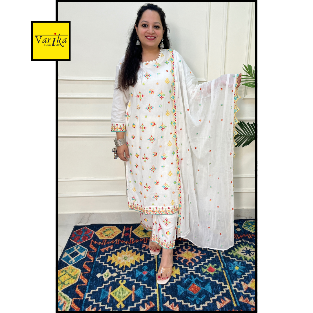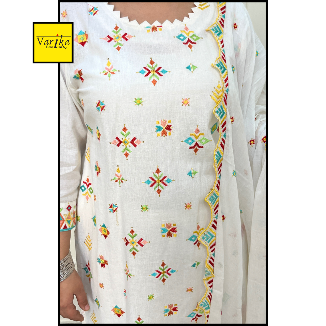 White Cotton hakoba Multi Colour Embroidery teamed up with a cotton dupatta and pants.