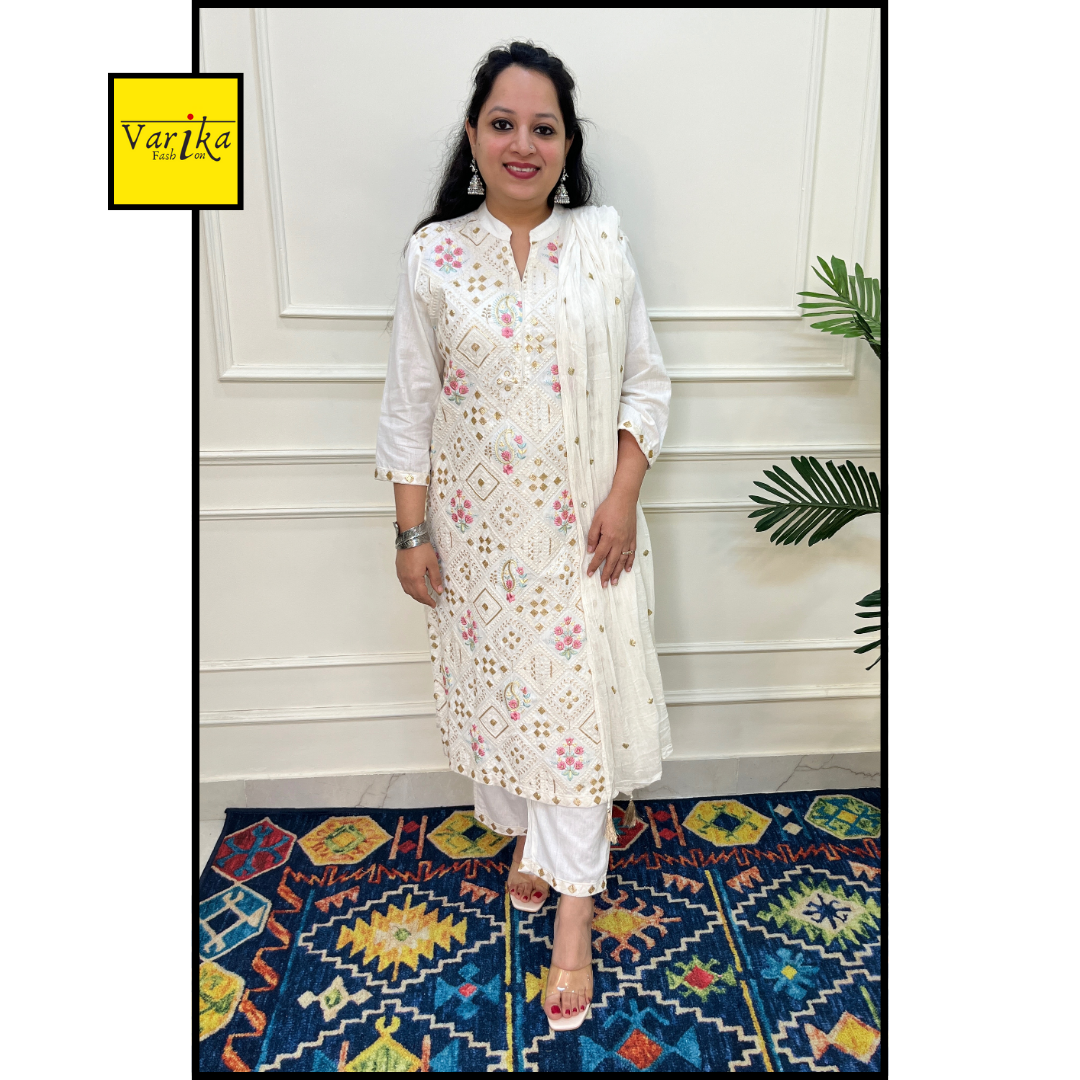 White Cotton hakoba Multi Colour Embroidery teamed up with a cotton dupatta and pants.