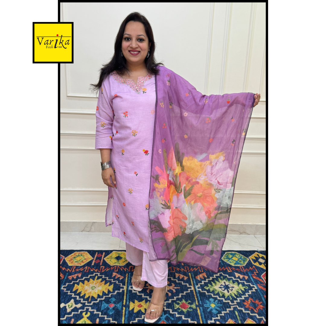 Digital Print Lavender Colour placement printed Kurta set with light embroidery on the neck of the kurta. The pants are printed in straight fit and the dupatta is printed in mul cotton fabric.