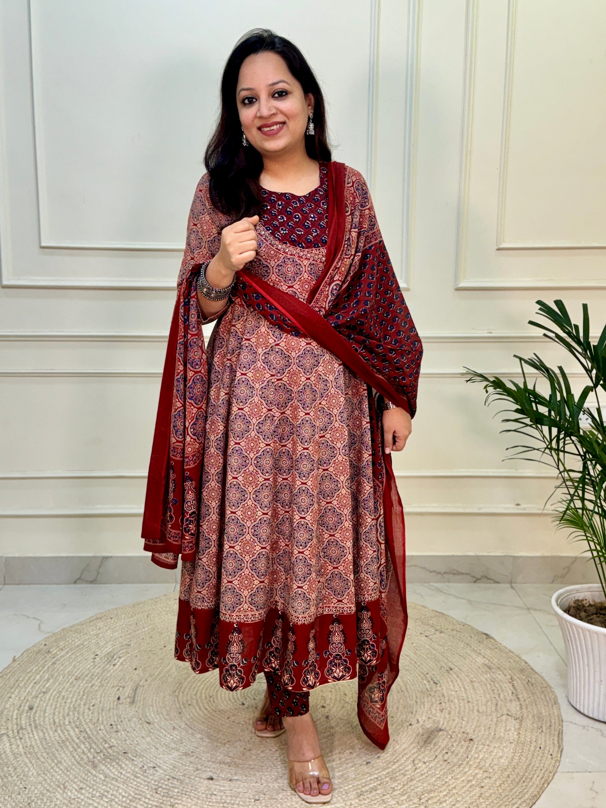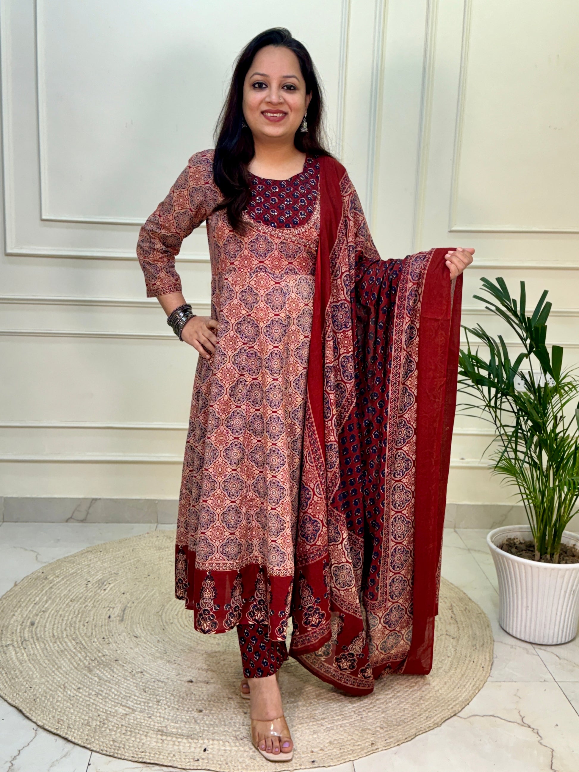Farhat Kalamkari Anarkali Suit set-Red Colour