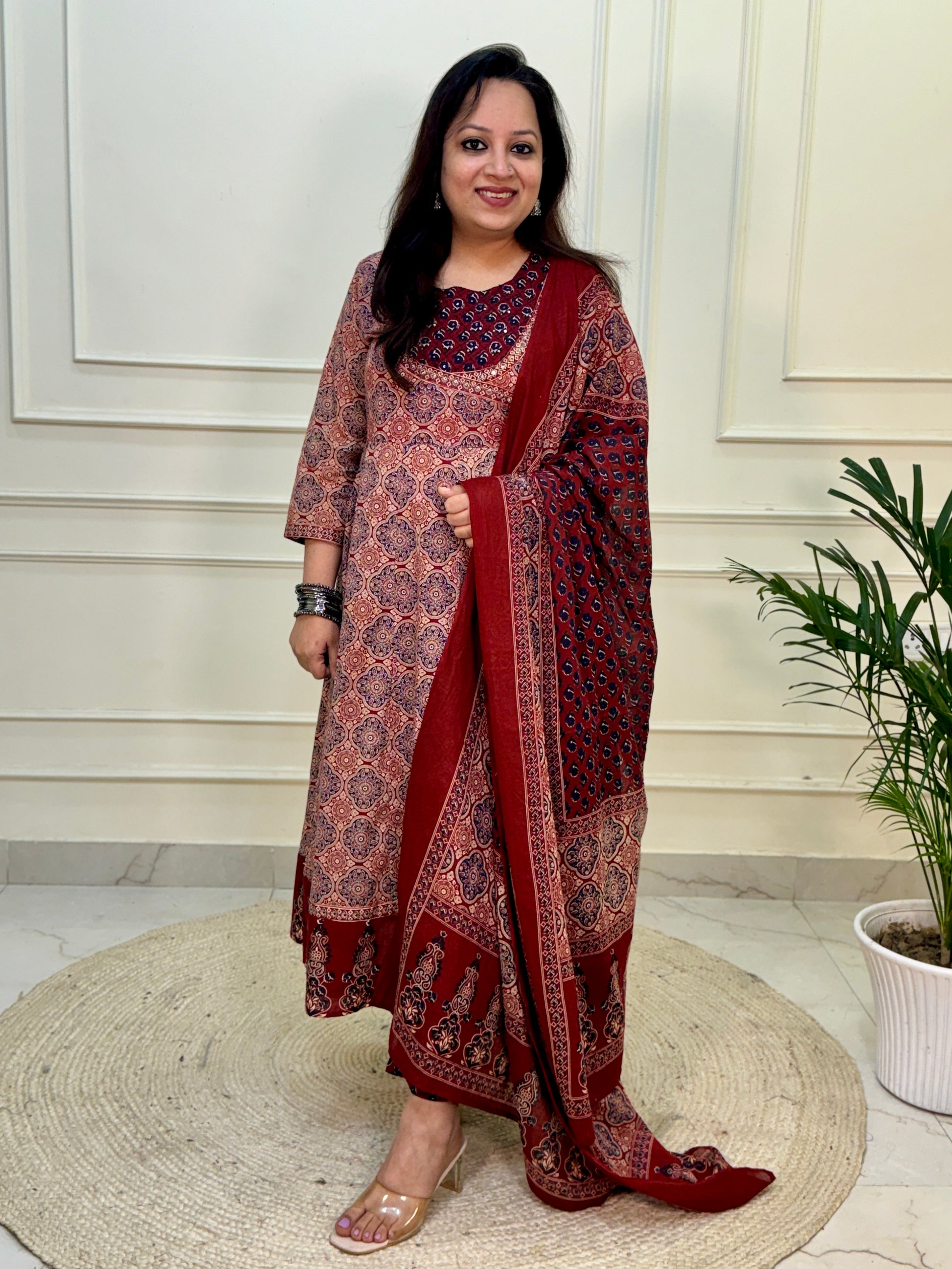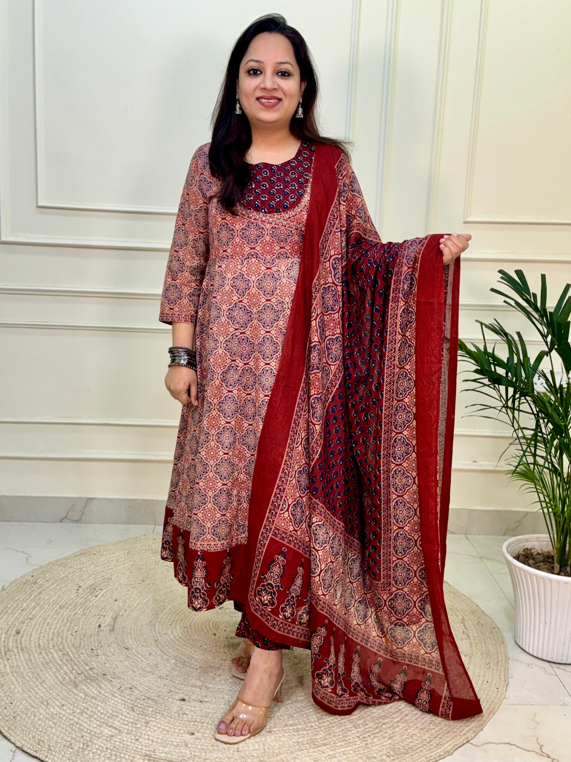 Red Kalamkari printed Alia Cut Kurta set with thread embroidery on the yoke of the kurta. The pants are plain with trouser fit and the dupatta is printed in mul cotton fabric. The sleeves are 3/4th.