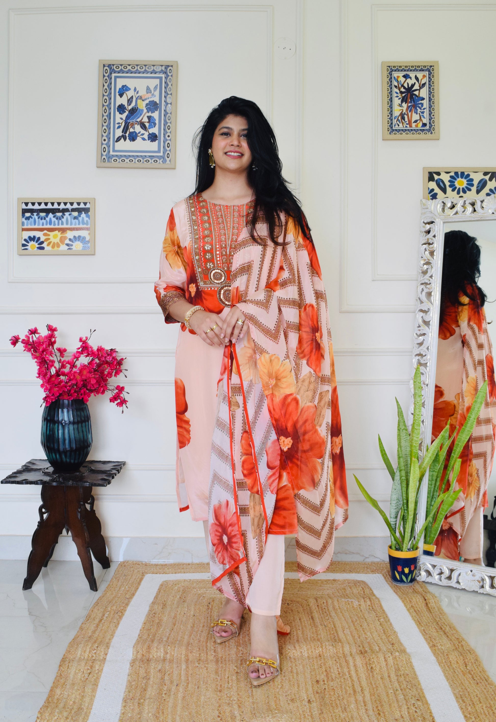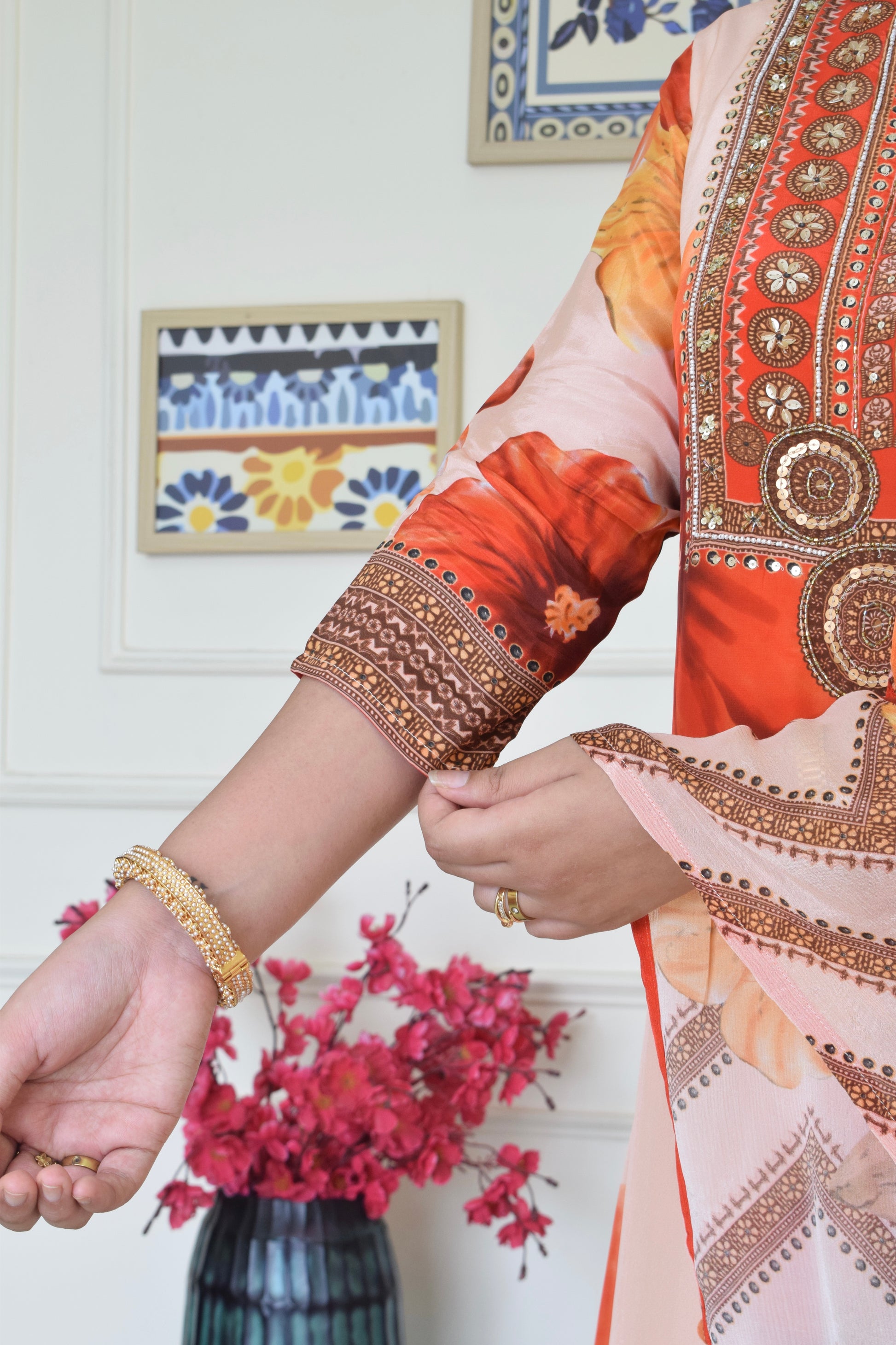 Pure Mul Chanderi Aline Suit set with intricate hand embroidery- Orange