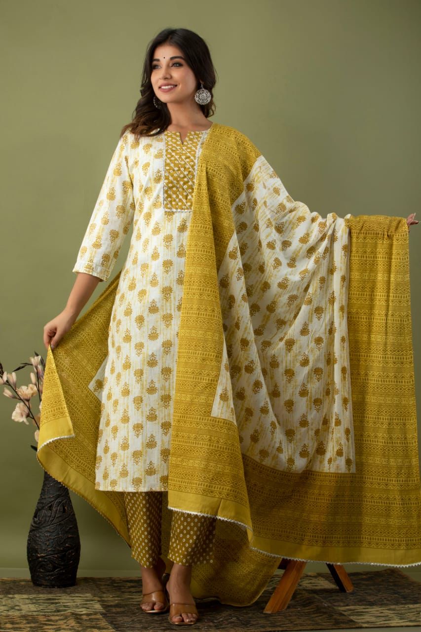 Green Colour beautiful 3 pc pure cotton suit set. The kurta yoke has light gota work and its teamed up with a printed pants and printed cotton dupatta.