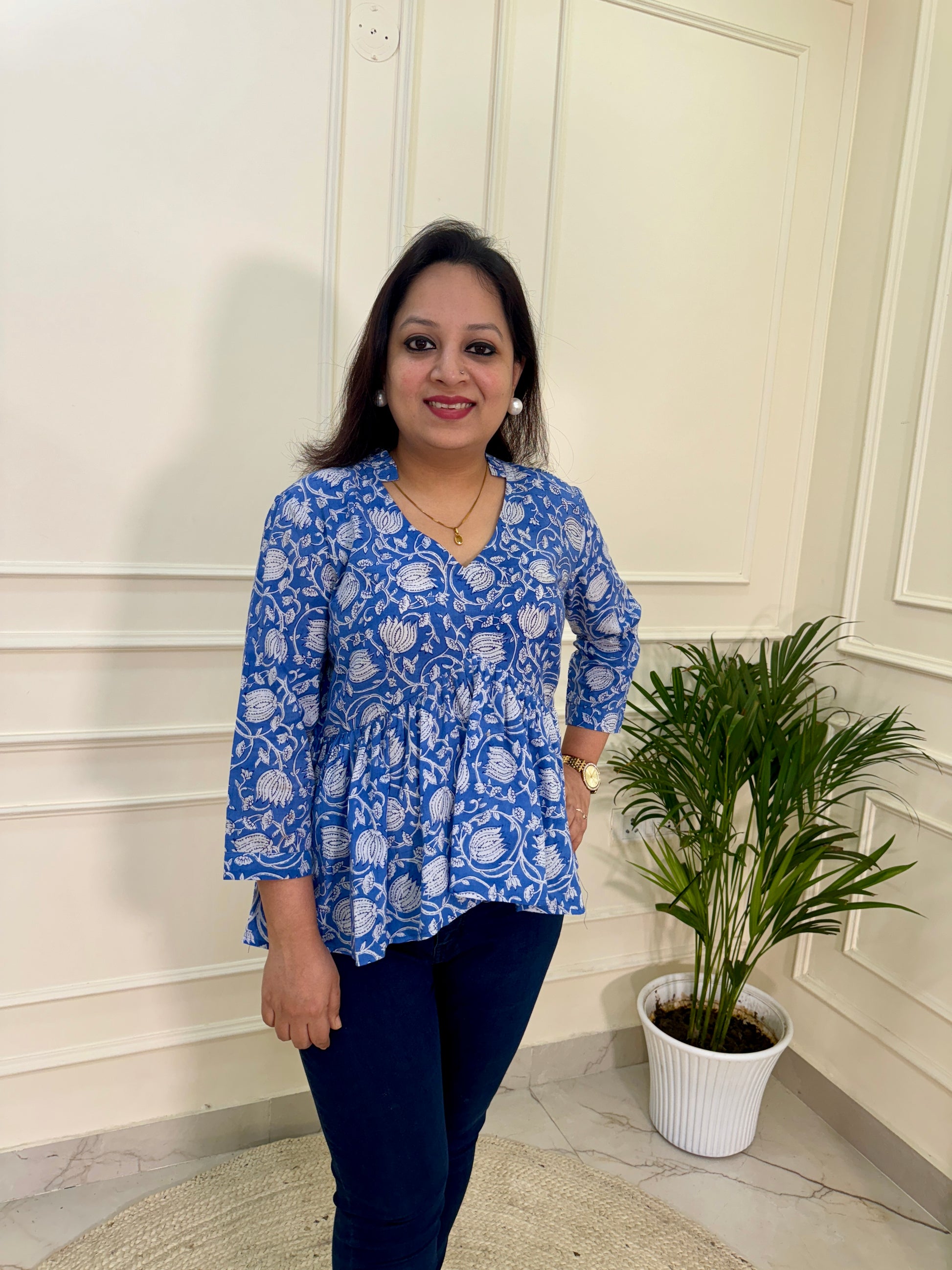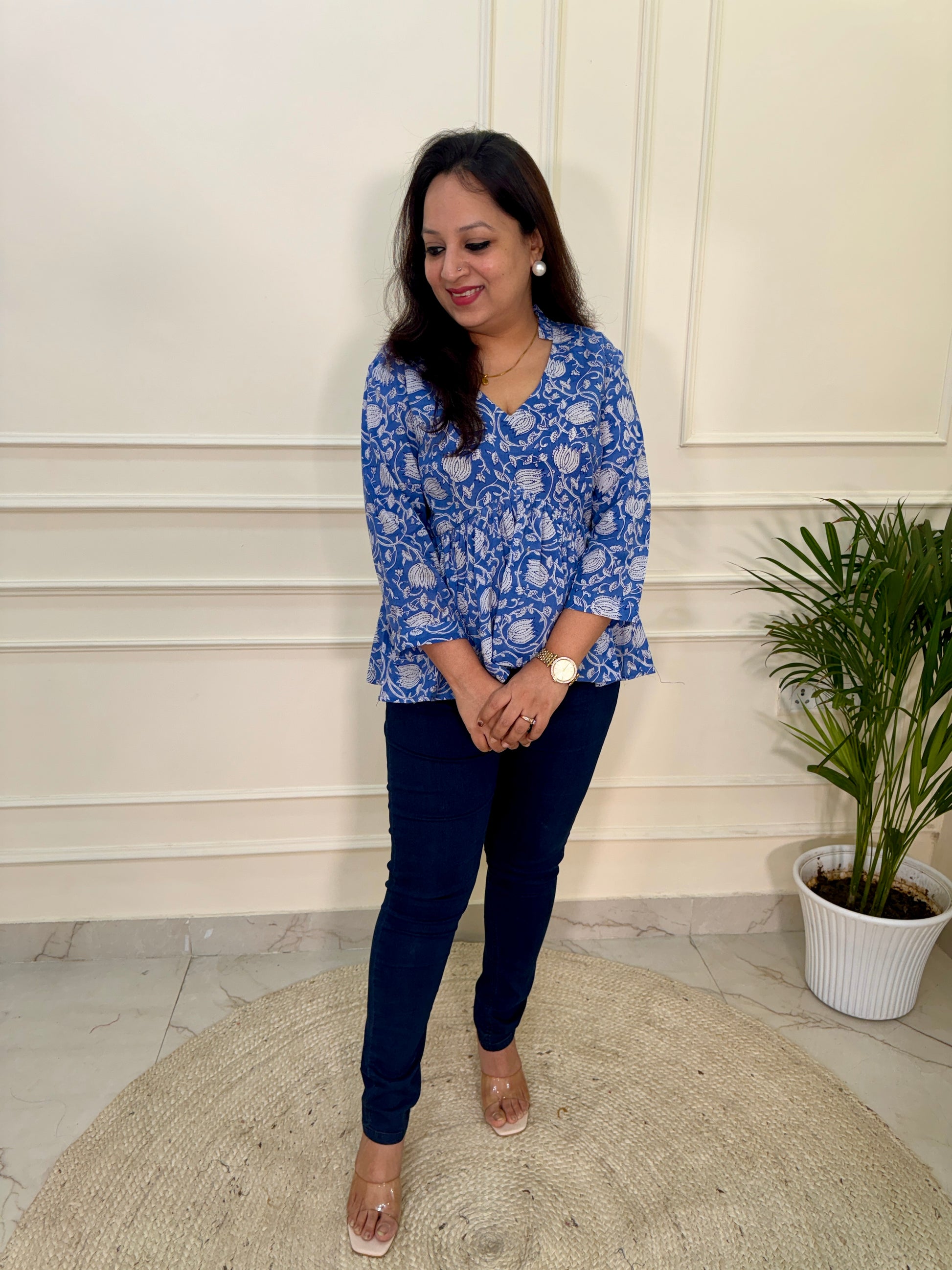 Hand Block Print Floral Gather Top-Blue