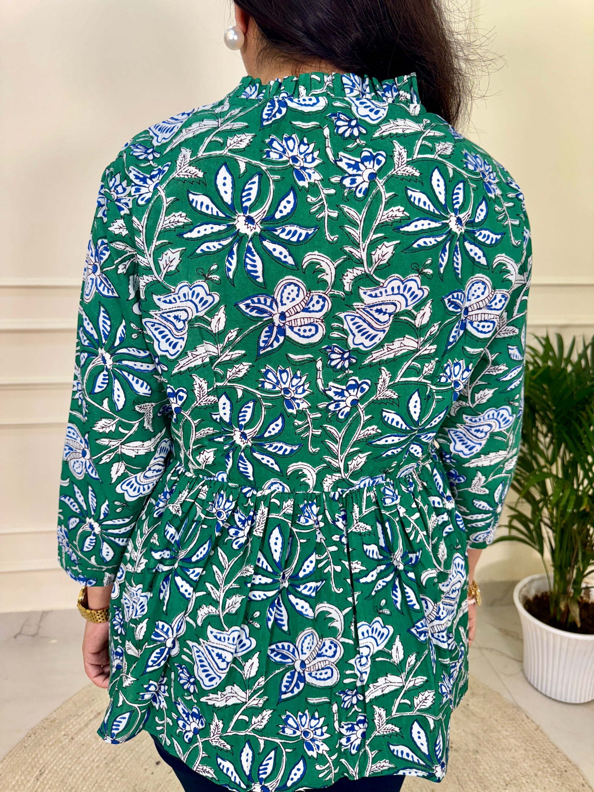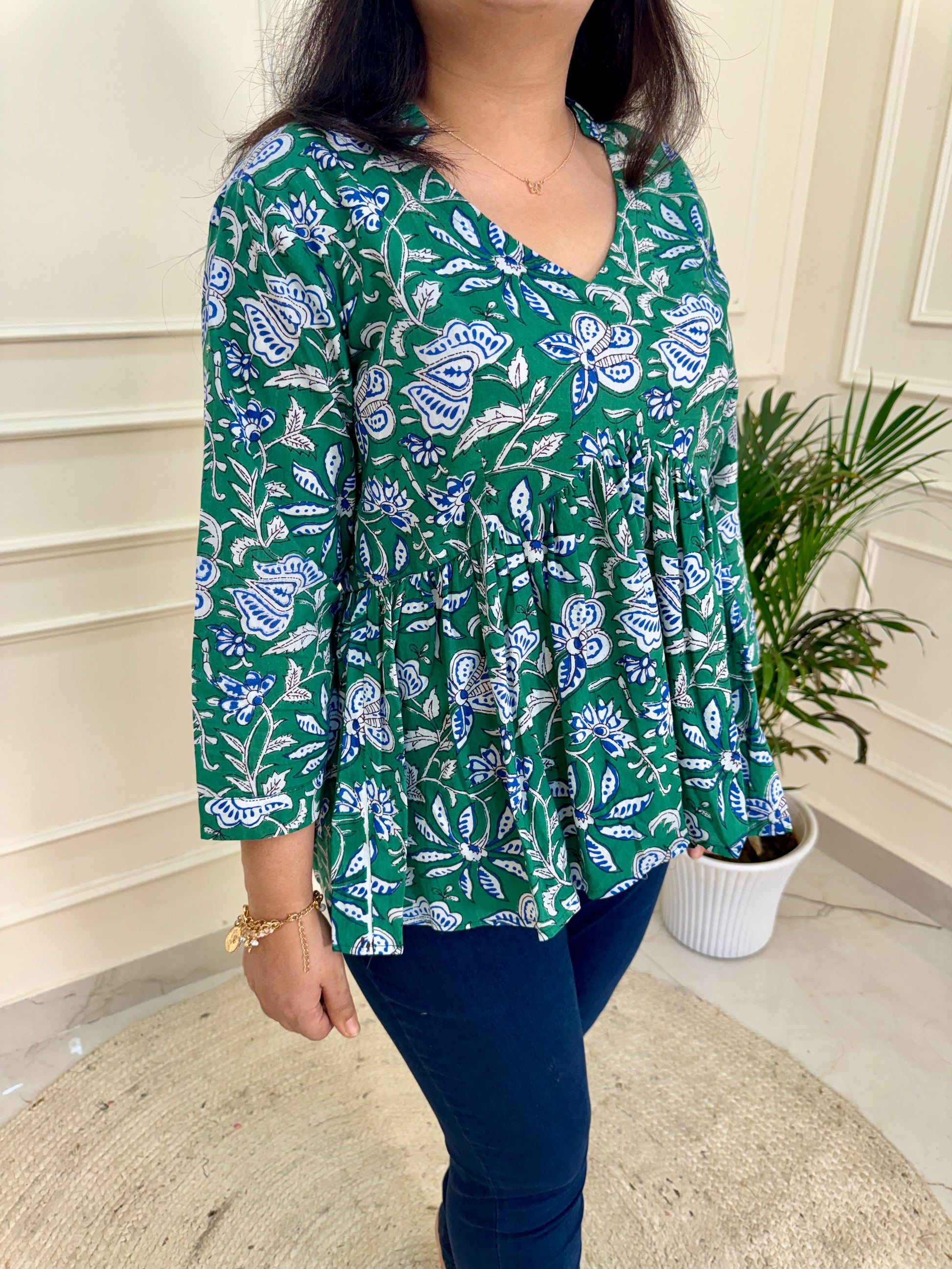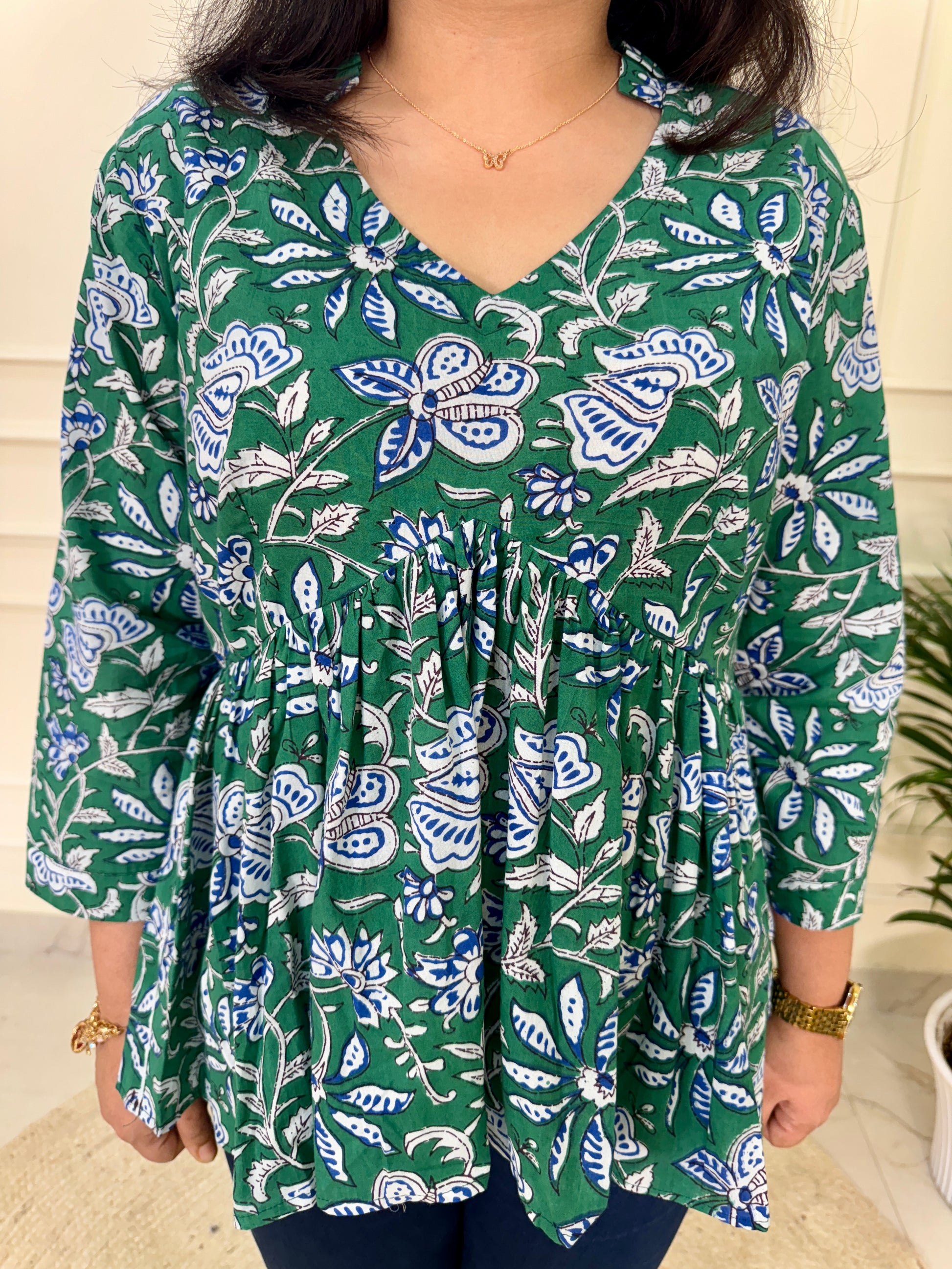Pure Cotton Top with gather detailing and half gathered collar V-neck.