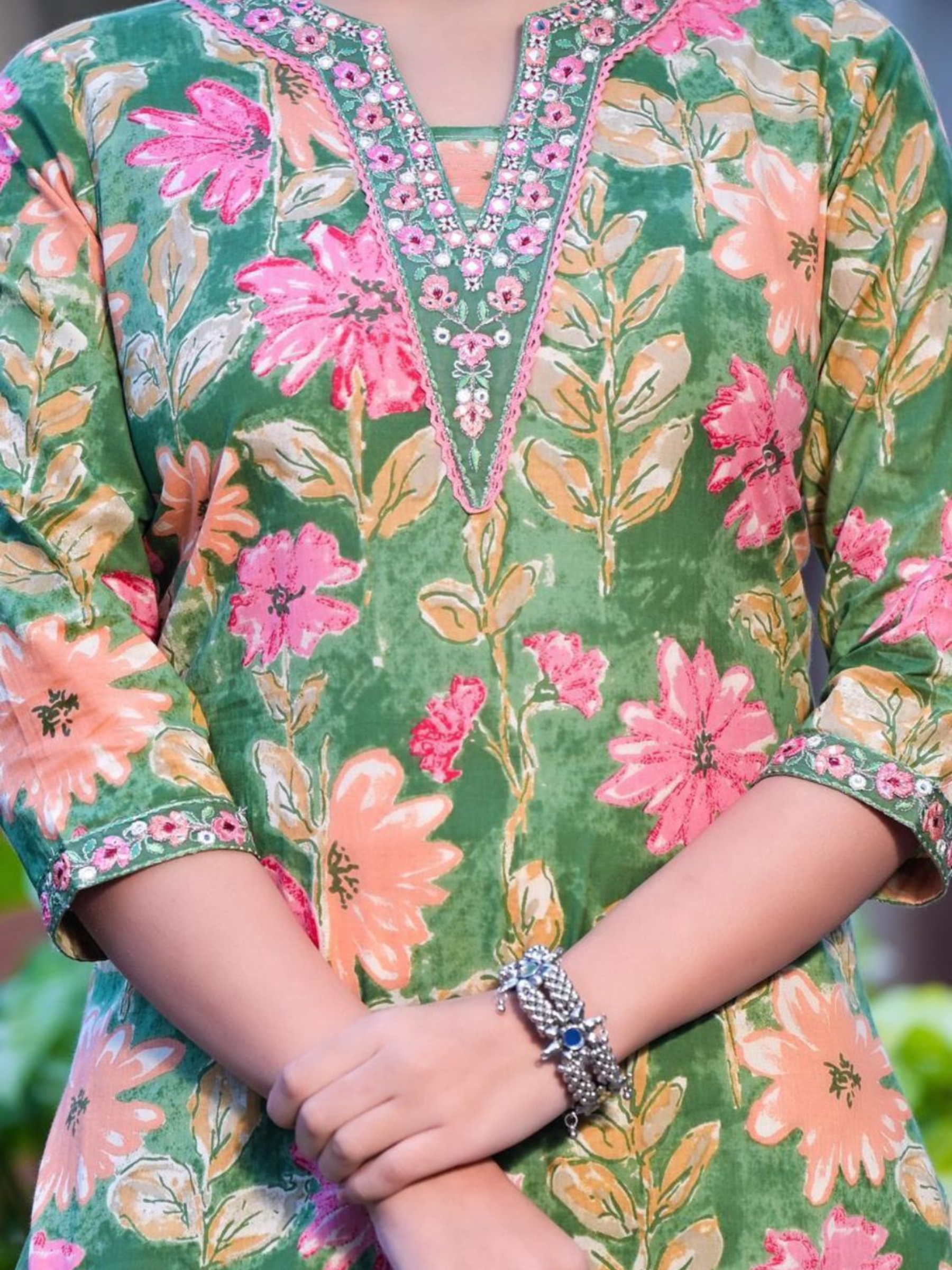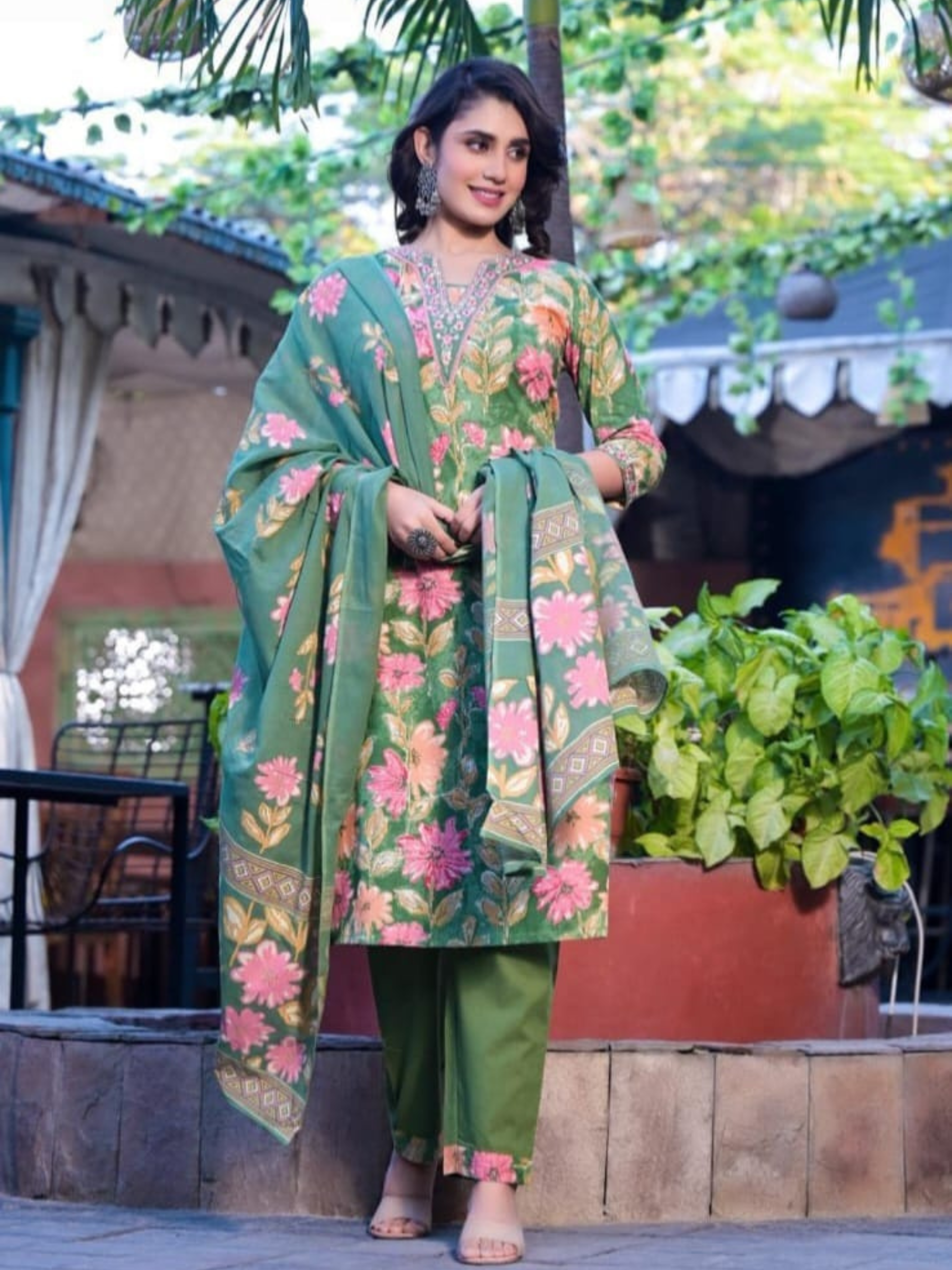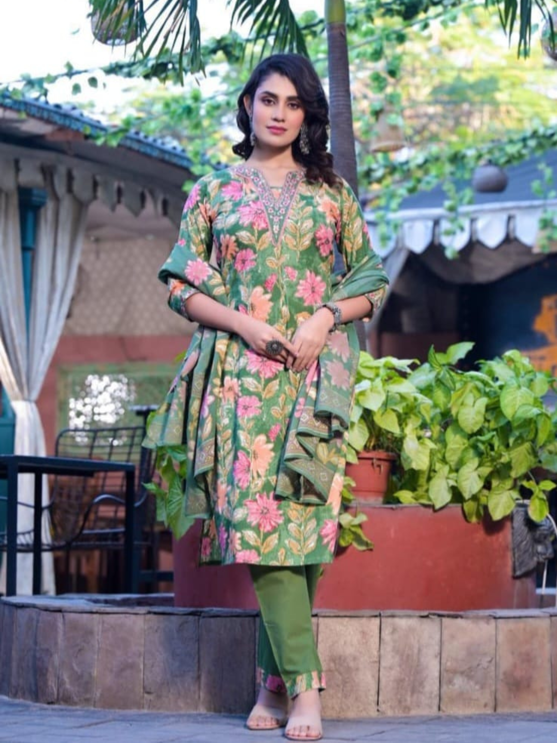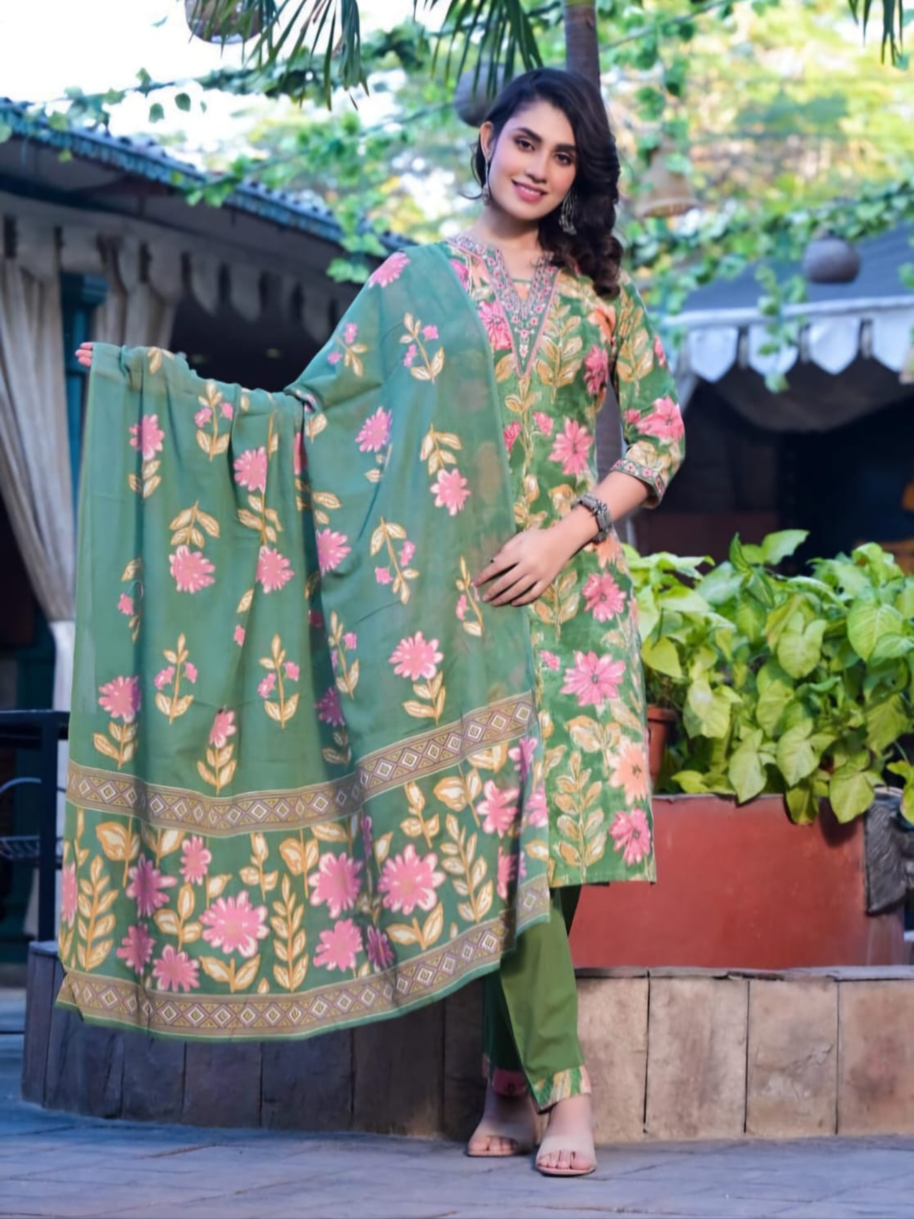 Ethereal printed pure cotton suits for your daily requirement. The Kurta set has V neck kurta with light embroidery detailing. The pants are in trouser fit and the dupatta is printed in mul cotton fabric. The sleeves are 3/4th.