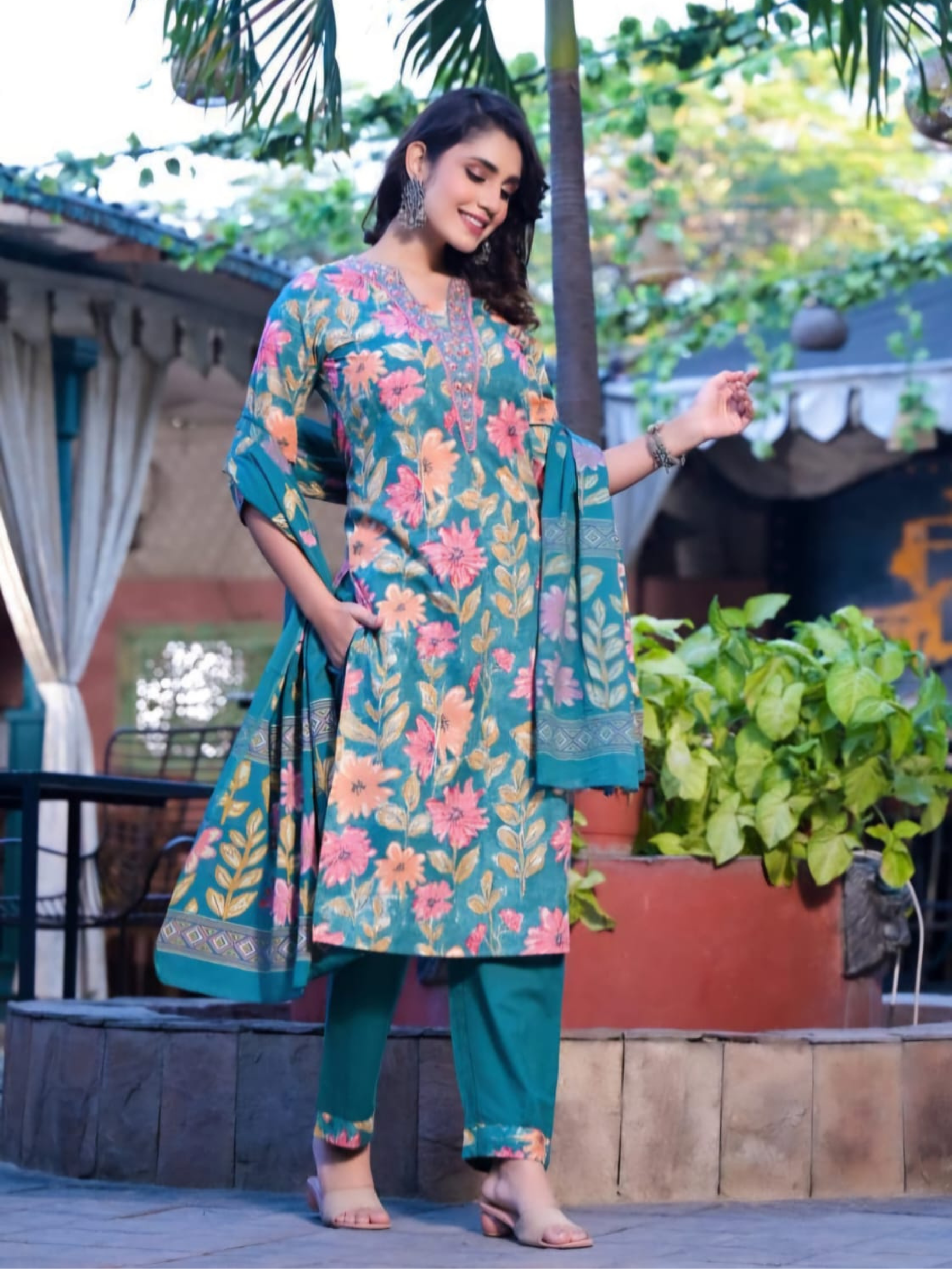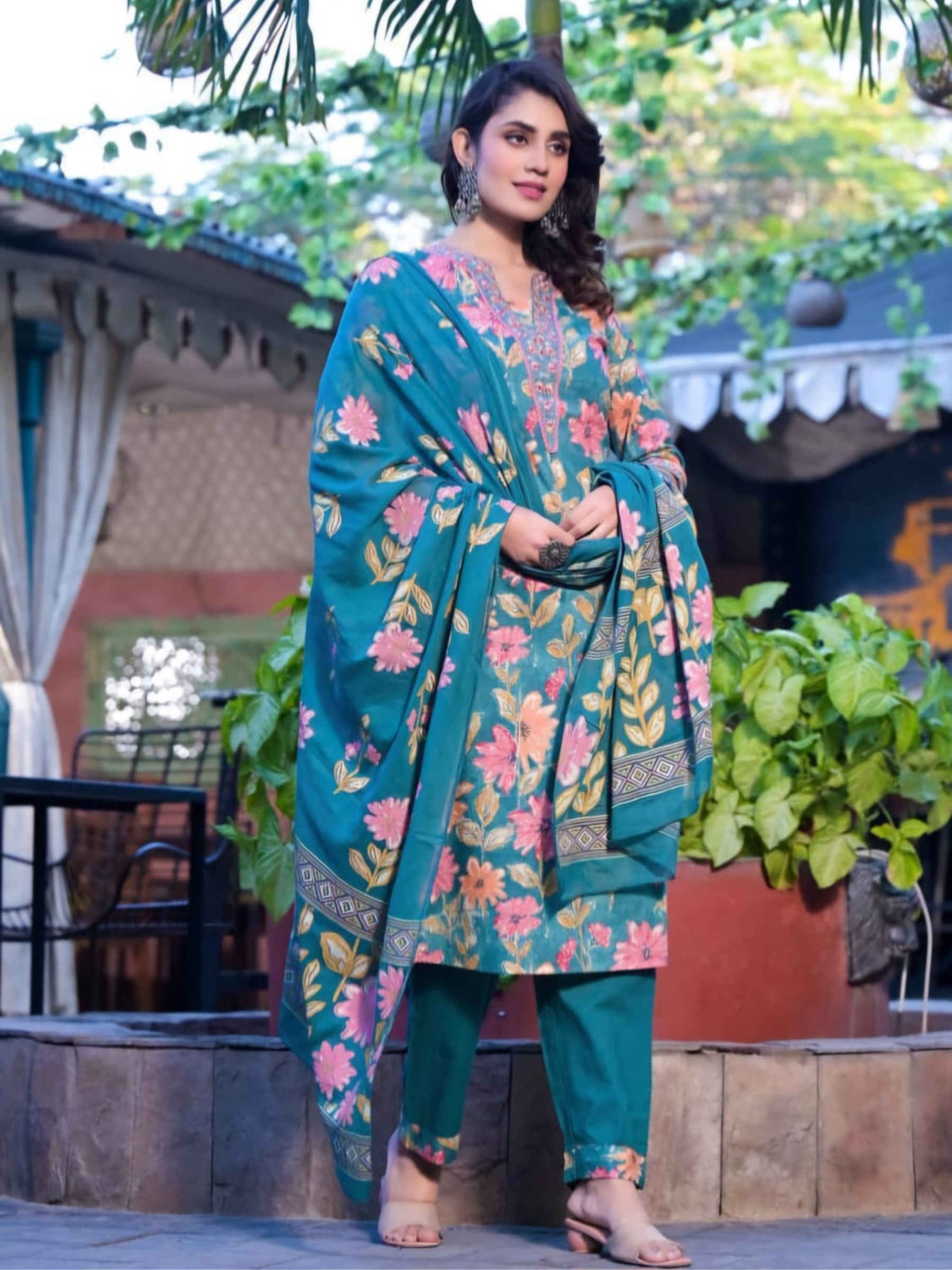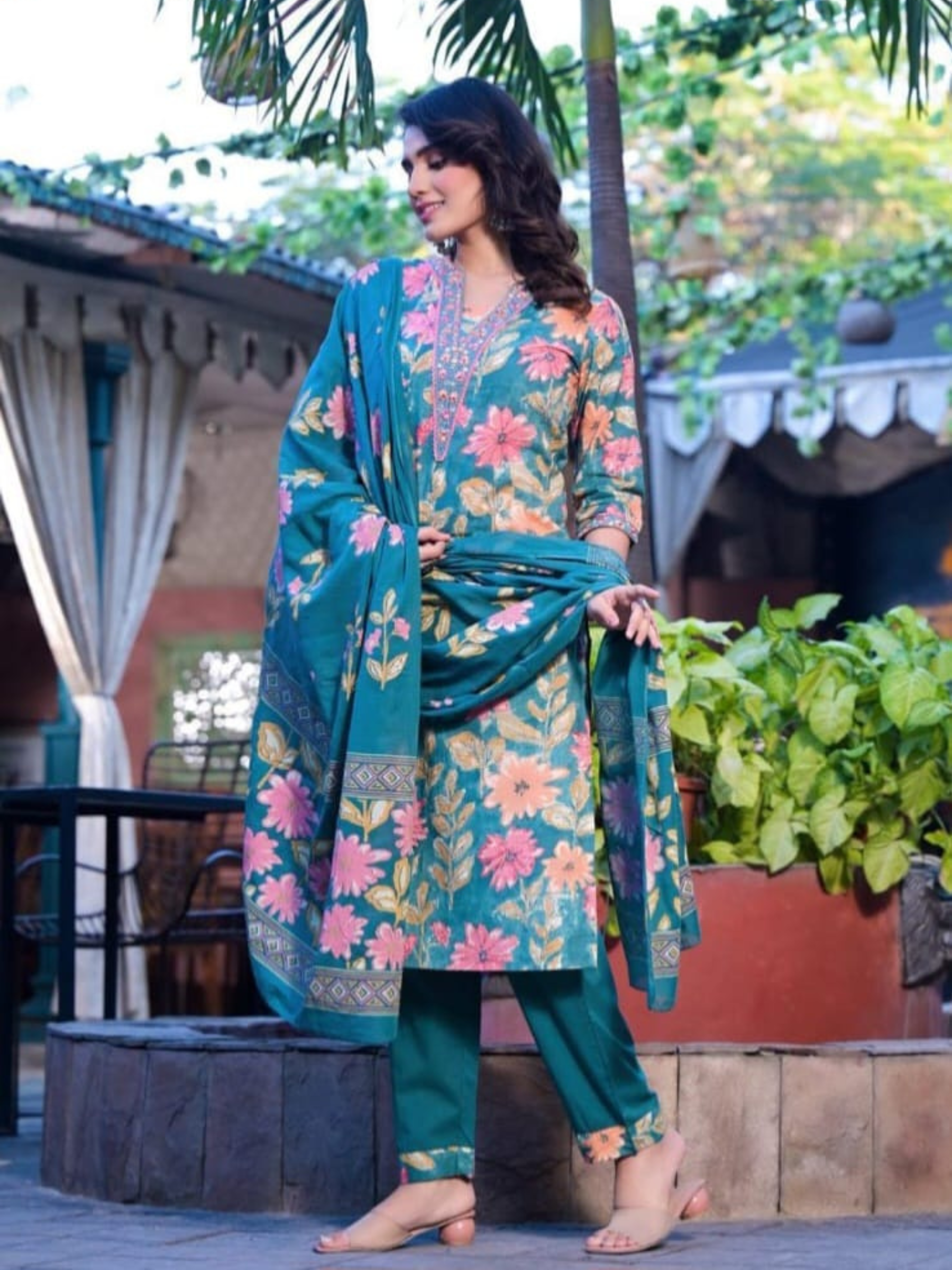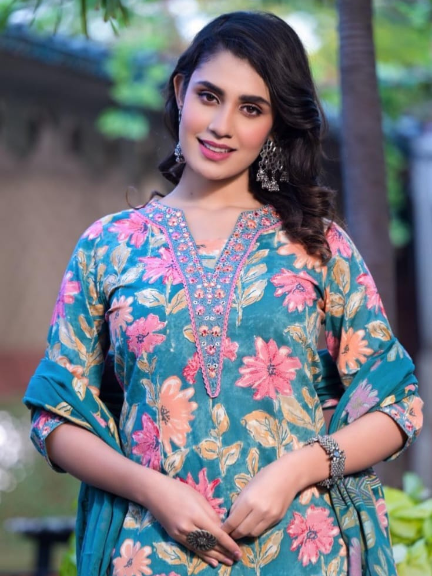 Ethereal printed pure cotton suits for your daily requirement. The Kurta set has V neck kurta with light embroidery detailing. The pants are in trouser fit and the dupatta is printed in mul cotton fabric. The sleeves are 3/4th.