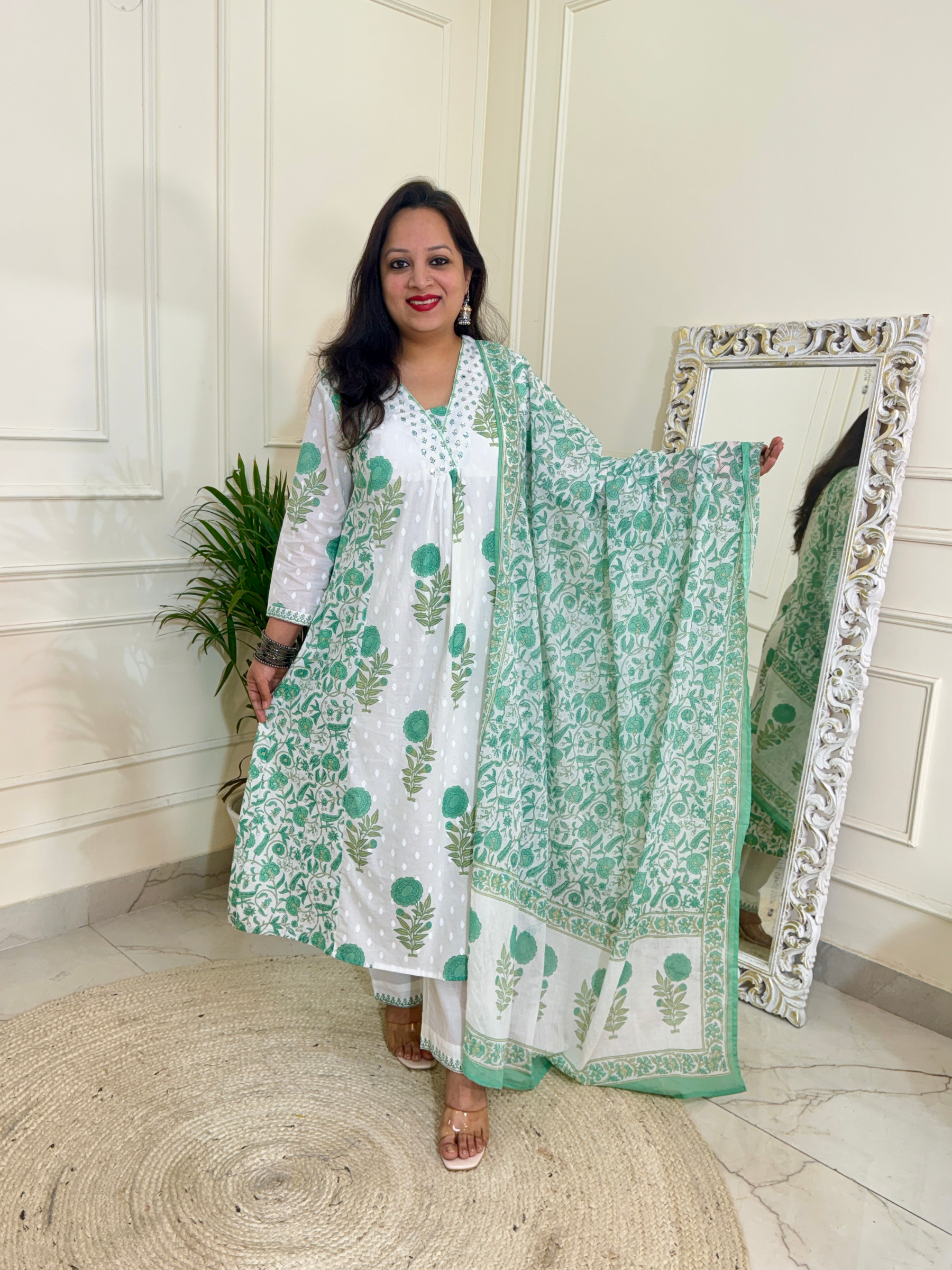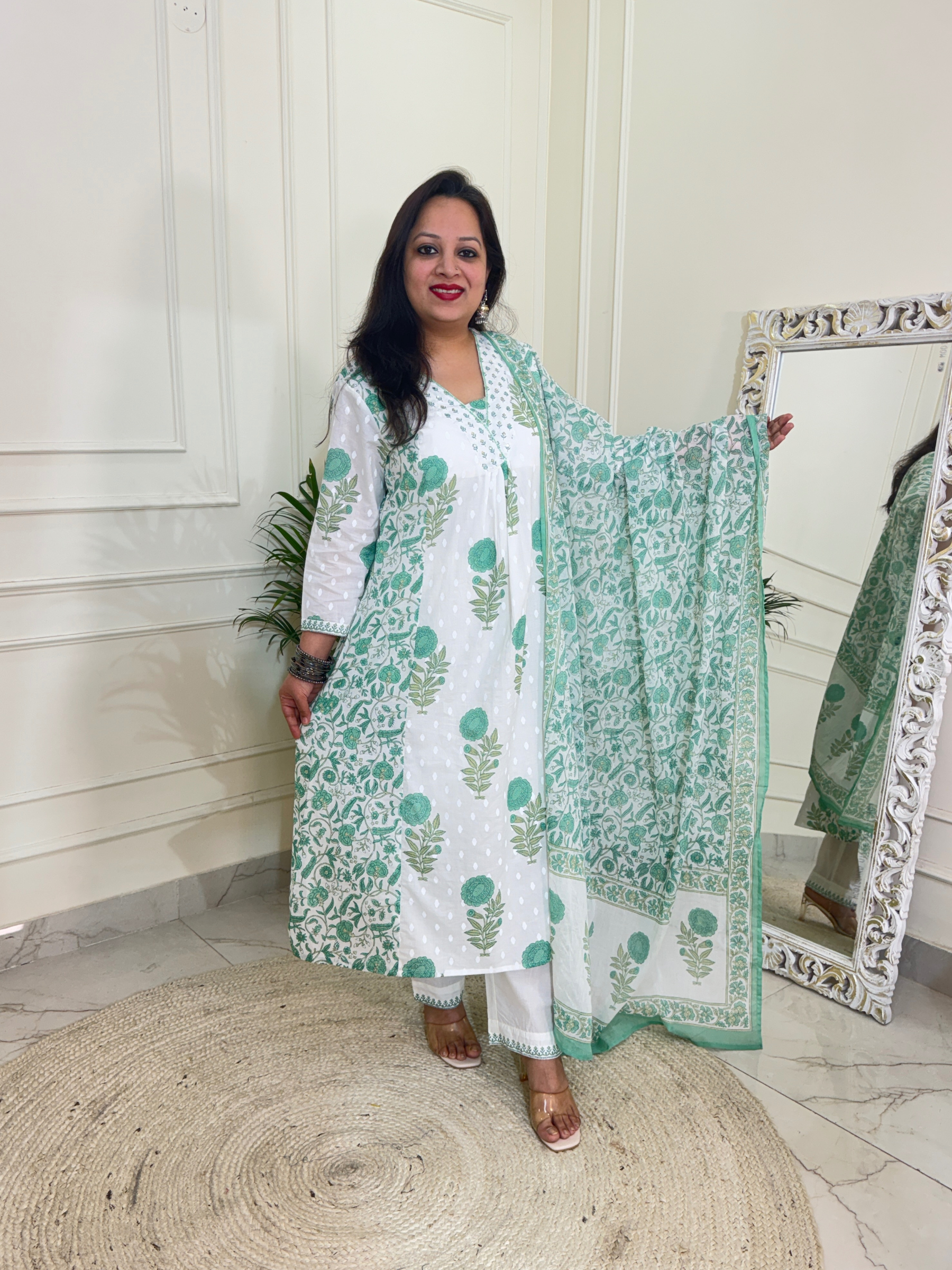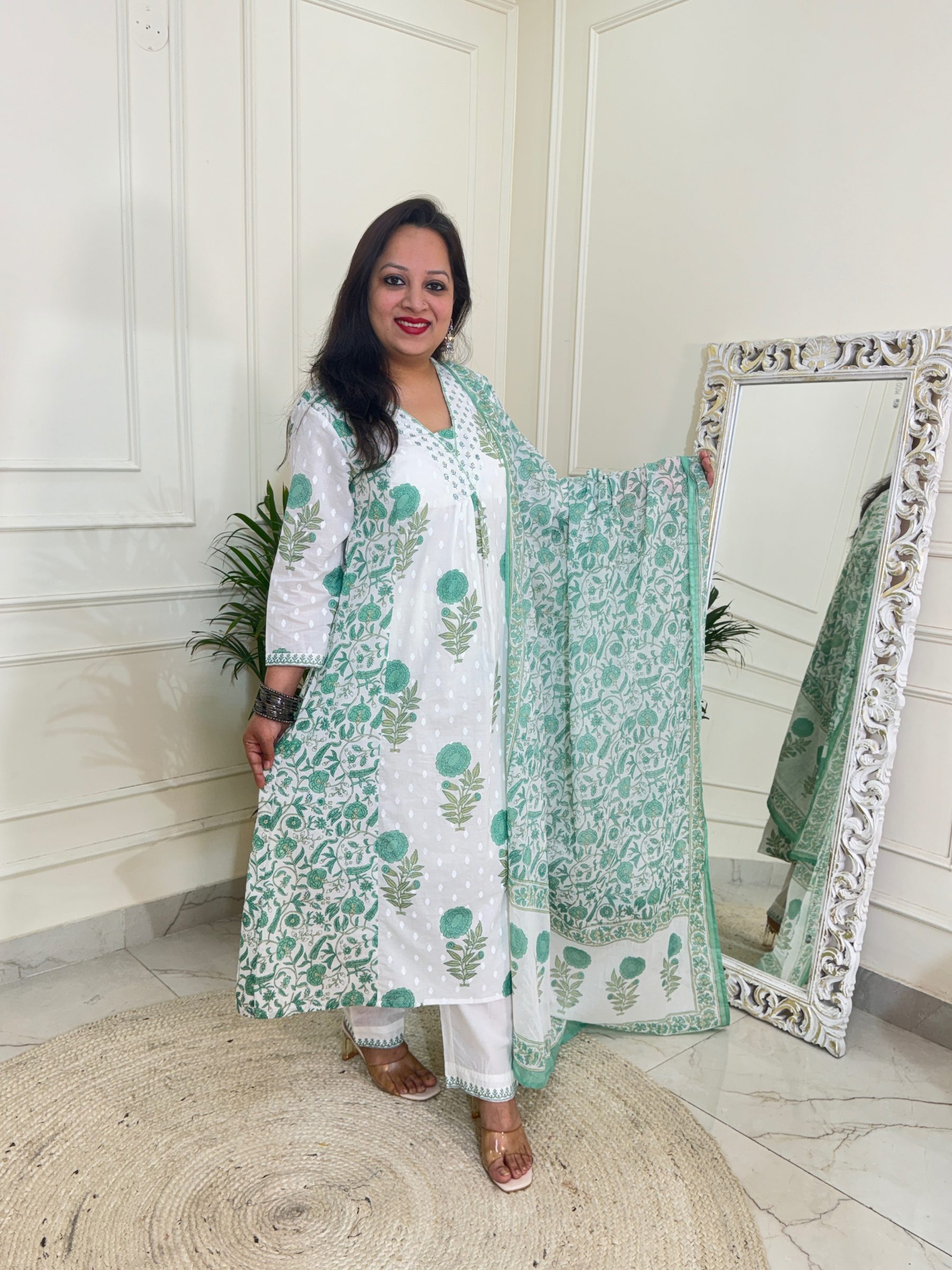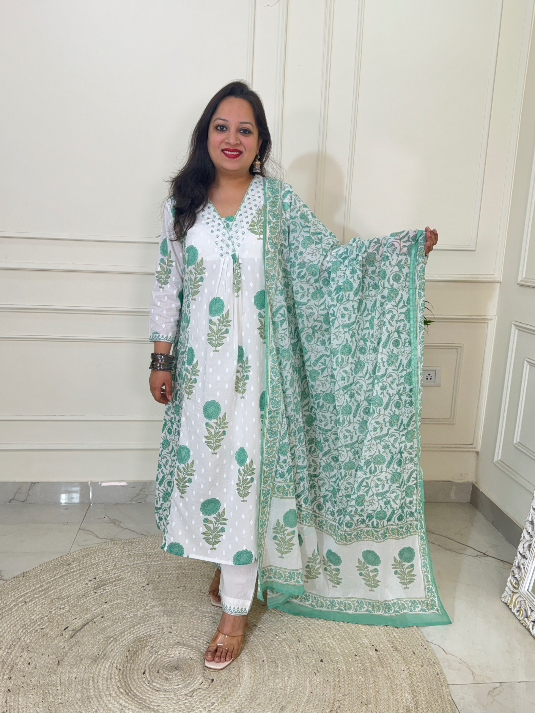 Pure Mul Chanderi Aline Suit set with intricate hand embroidery- Green