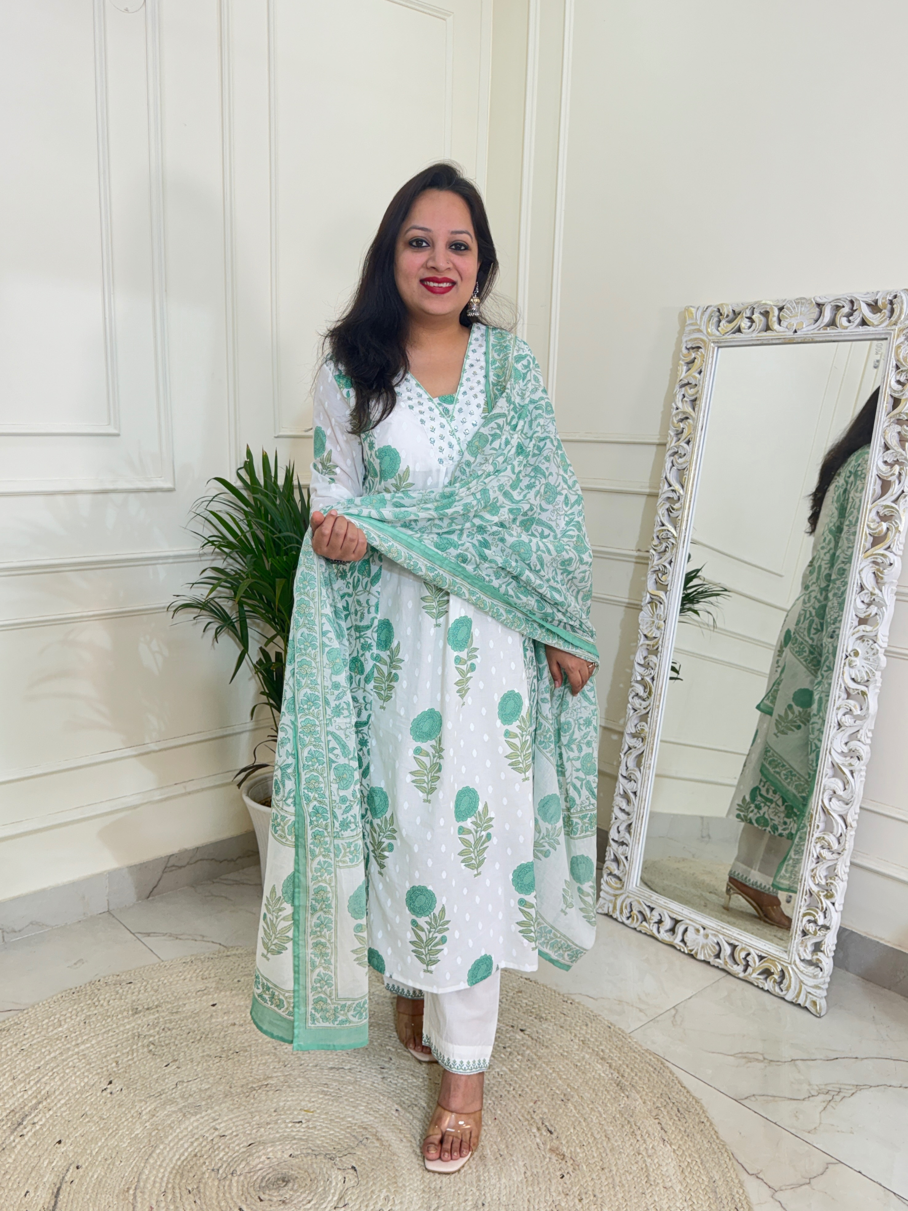 Our New White Pink Floral Print Aline Suit Set with light embroidery on the neck line