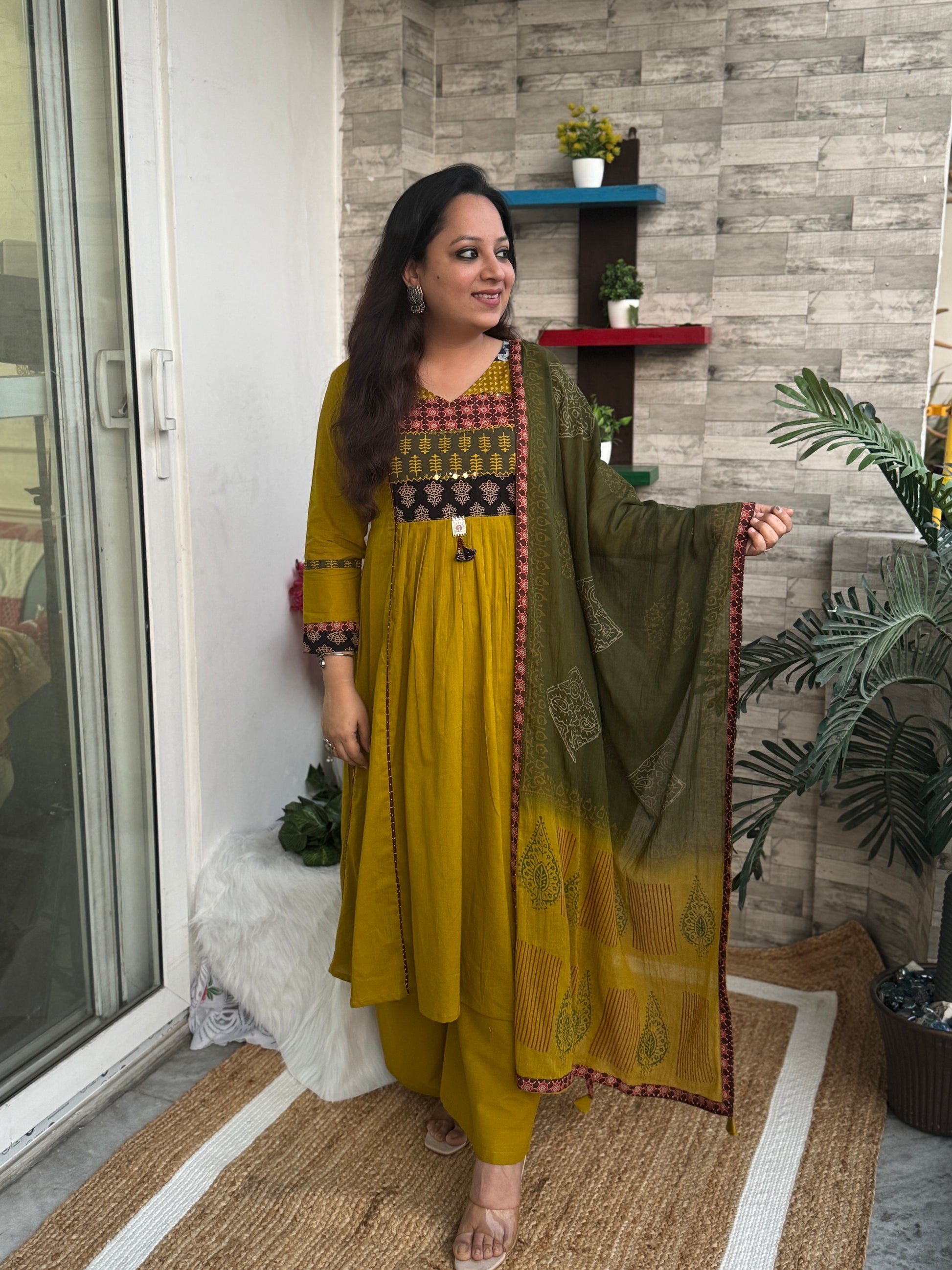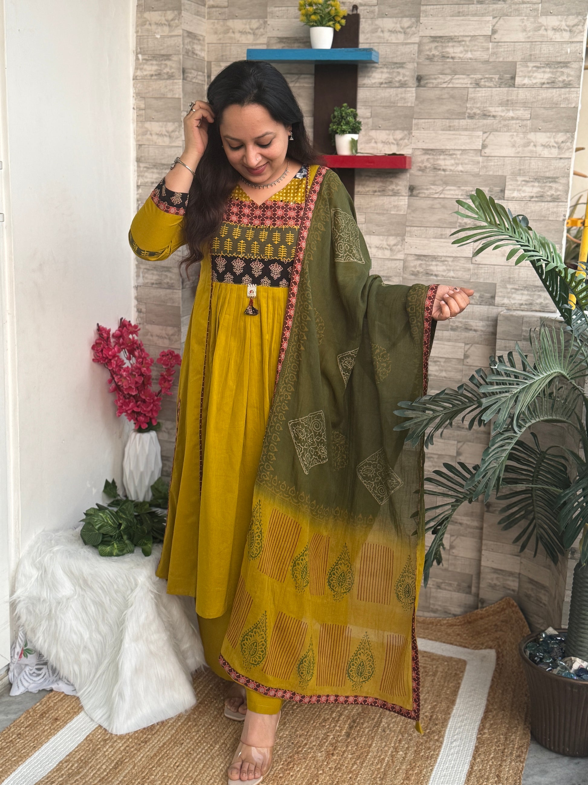 Multi Yellow Mustard Aline 3 piece premium Cotton Suit Set- Mustard