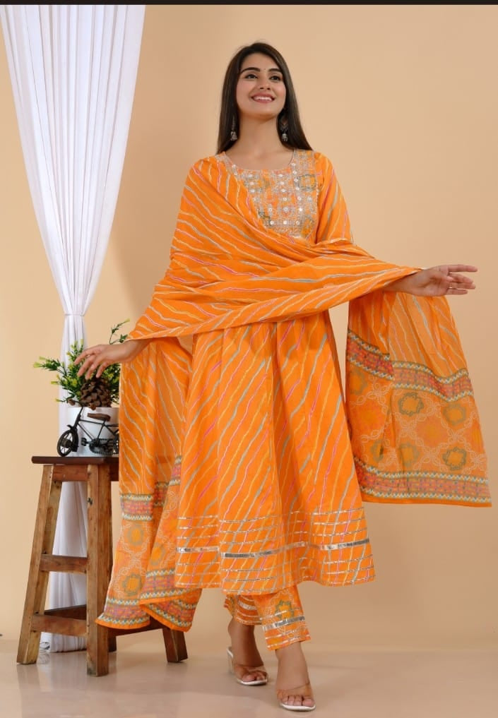 Orange Leheriya Print beautiful 3 pc pure anarkali cotton suit set. The kurta yoke has beautiful gota and sequins embroidery and its teamed up with a printed cotton pants and printed cotton dupatta.