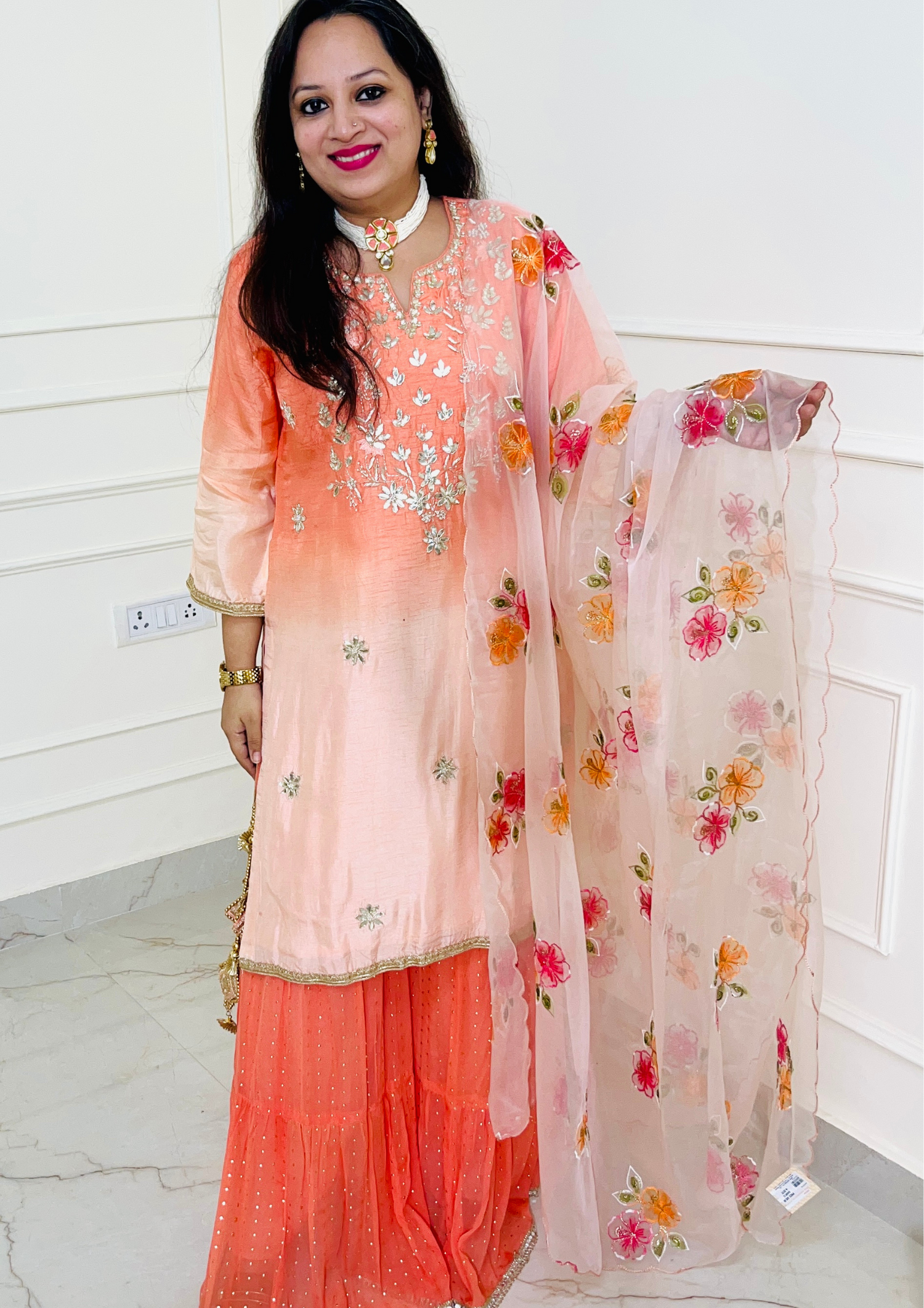 Semi Mul Chanderi Anarkali Suit set with hand embroidery- Peach