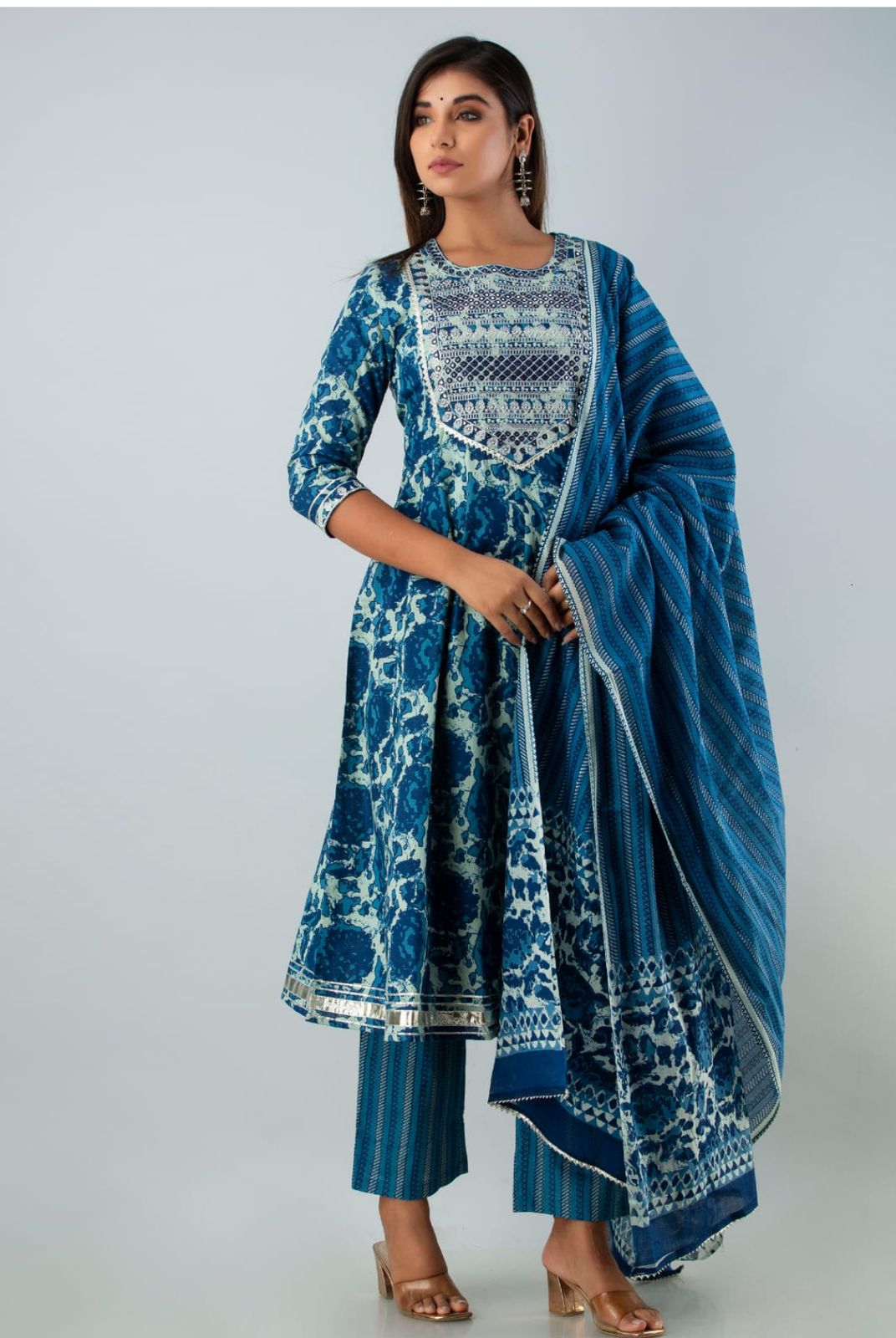 Pure Cotton Indigo Blue Colour Anarkali suit set. The kurta yoke has elegant zari embroidery and its teamed up with a printed pants and printed cotton dupatta.