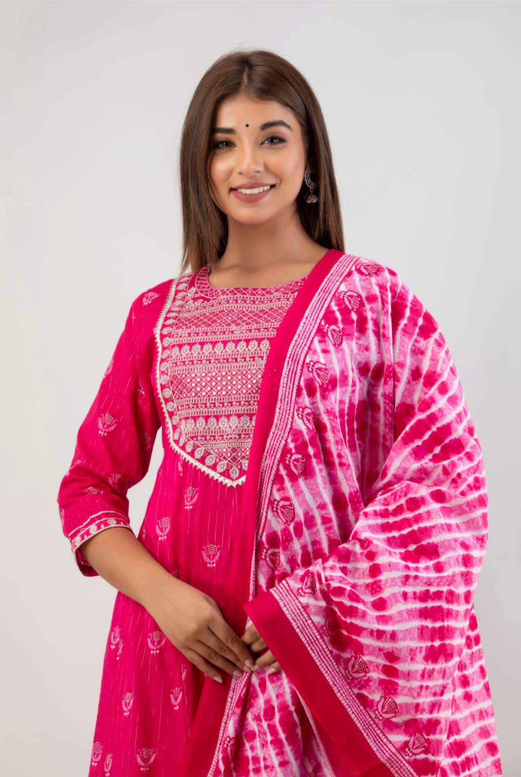 Pure Cotton Pink Colour Lurex Anarkali suit set. The kurta yoke has elegant zari embroidery and its teamed up with a printed pants and printed cotton dupatta.
