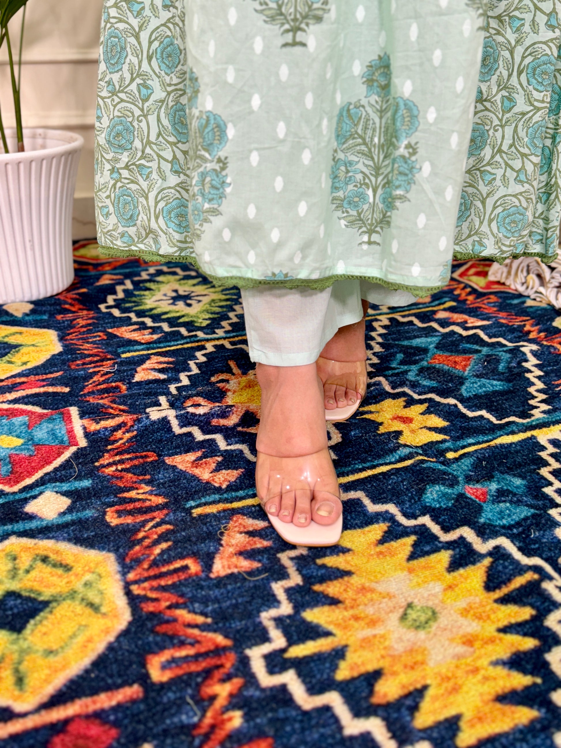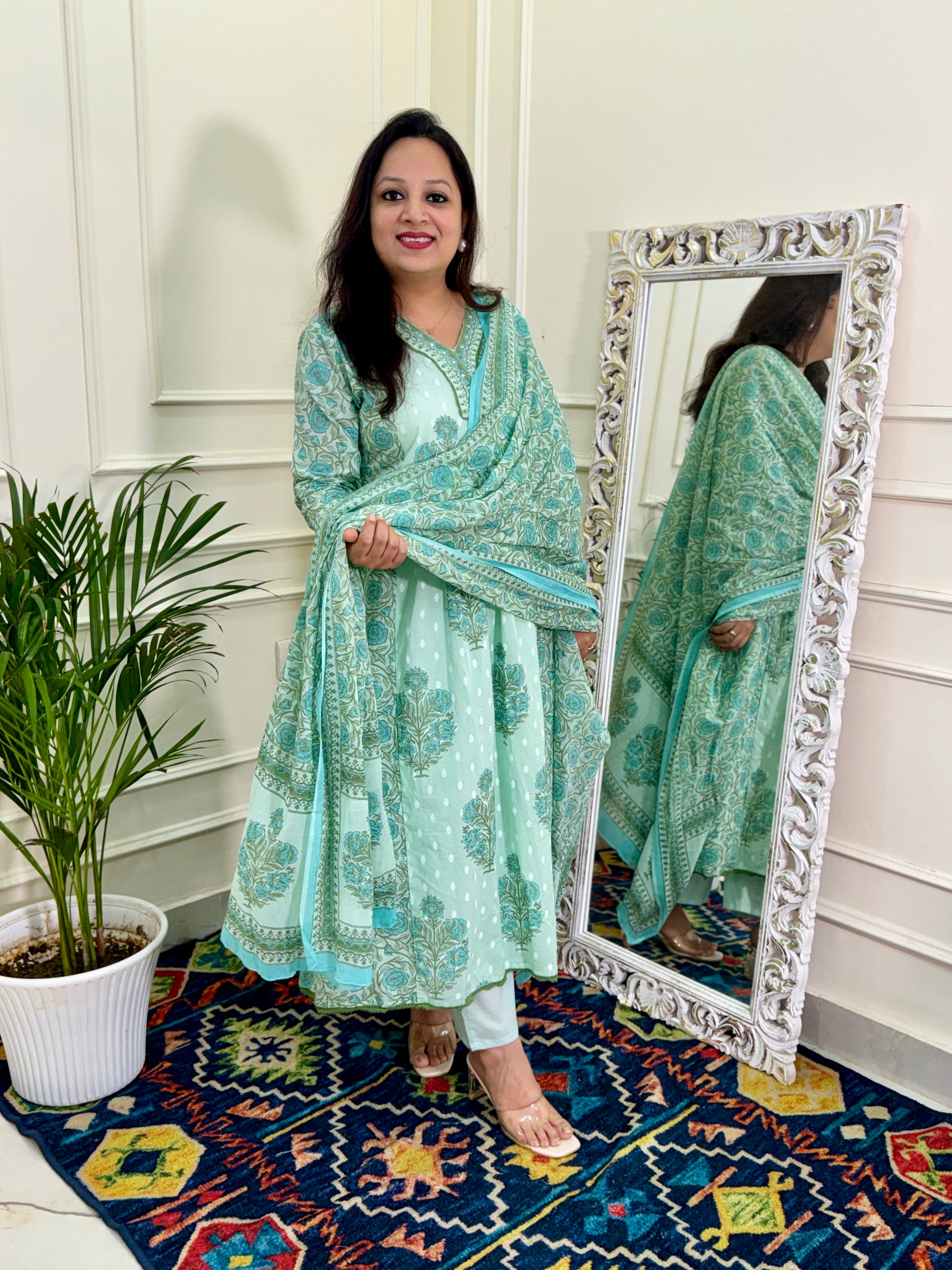 Block printed A line Kurta set with V neck. The pants are plain with trouser fit and the dupatta is printed in mul cotton fabric. The sleeves are 3/4th.