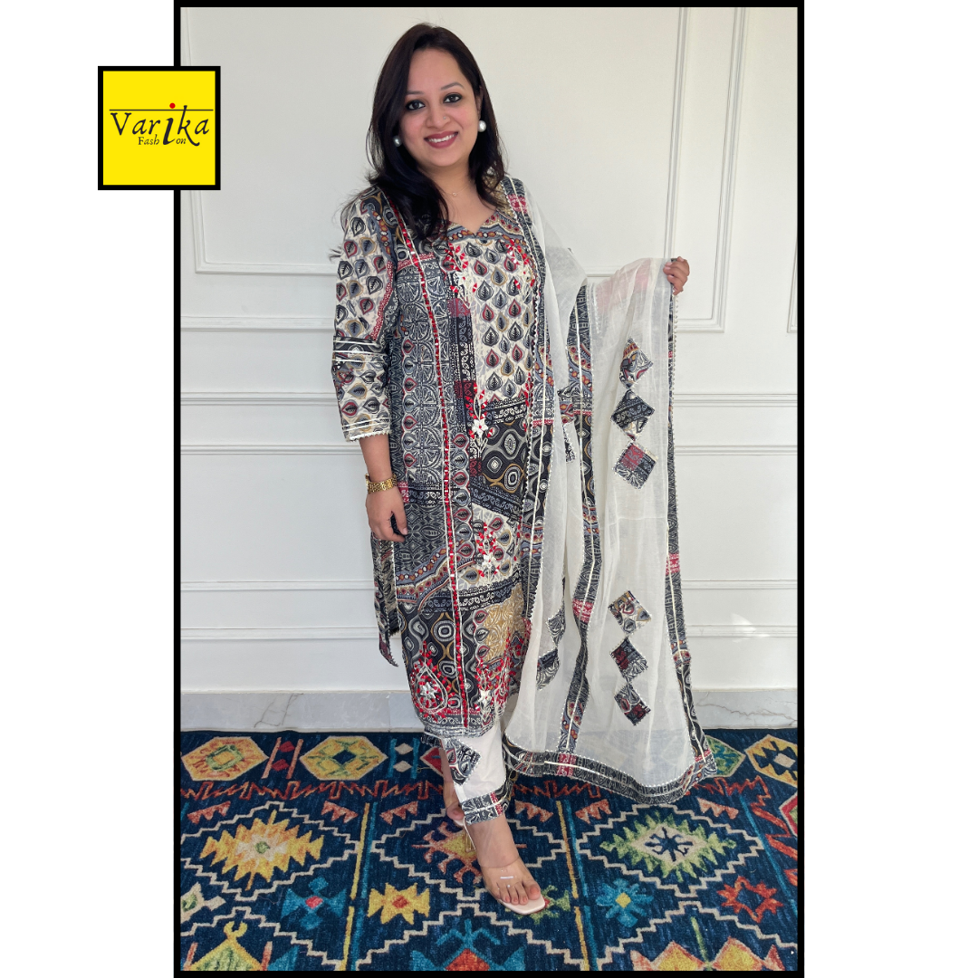 Patch Design Print Pure Cotton Suit with Mirror Embroidery on the Kurta and Patch Work Pant and Dup