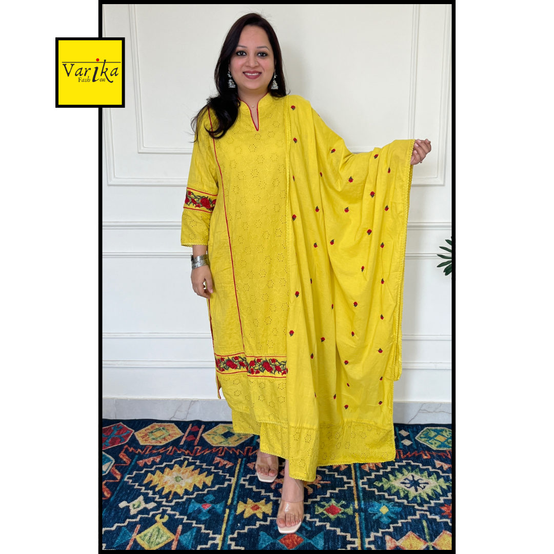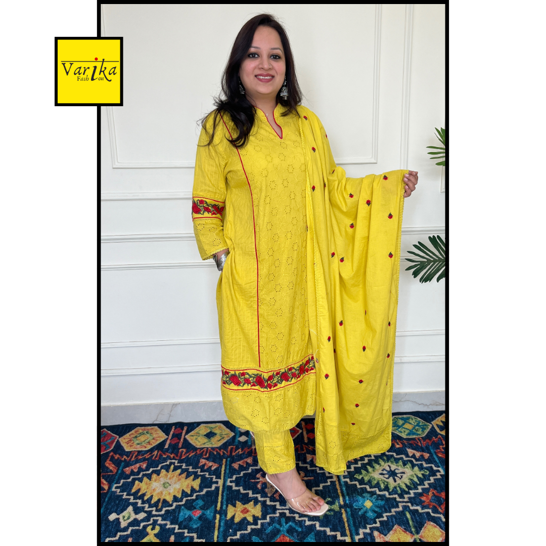 Pure Cotton Pleated Fabric 3 pc Suit Set with Floral Thread Embroidery on the Kurta and Dupatta- Yellow