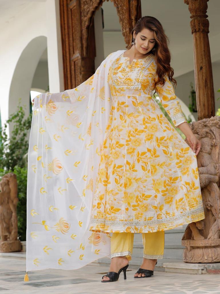 Ambi Embroidered Upada Silk Mustard Aline 3pc Suit
