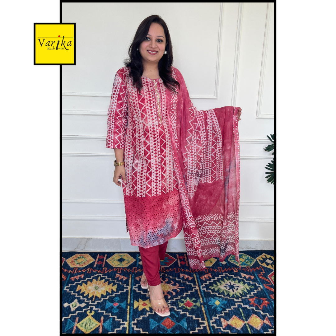 Pure Dobby Cotton with Baatik Print 3 pc Suit- Red colour