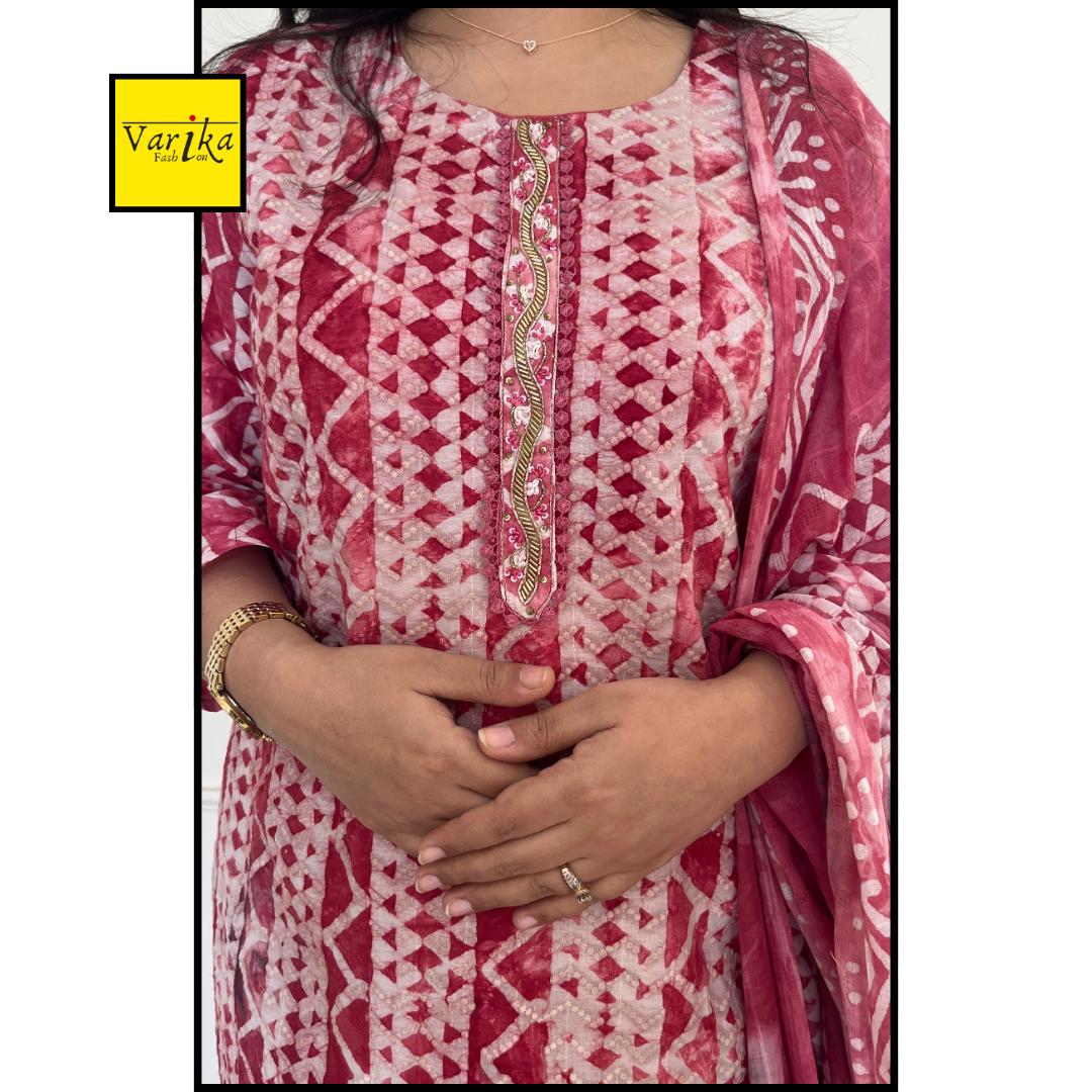 Pink Baatik printed Self cotton Straight Kurta set with light embroidery on the neck of the kurta. The pants are plain straight fit and the dupatta is printed in mul cotton fabric. The sleeves are 3/4th.