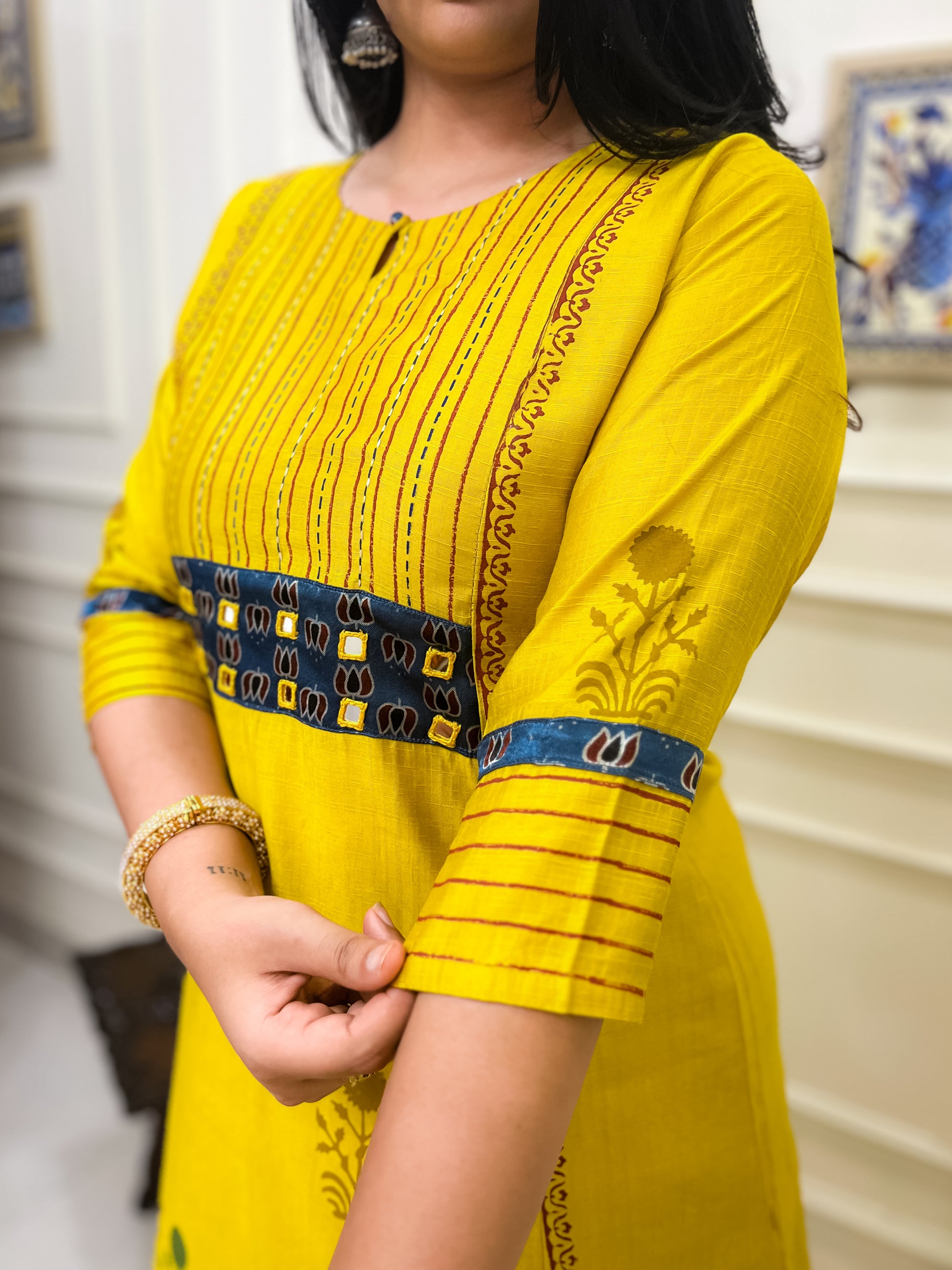 Mustard Pure Cotton V neck gajji Patti neck gamthi suit with mul dupatta and pants.