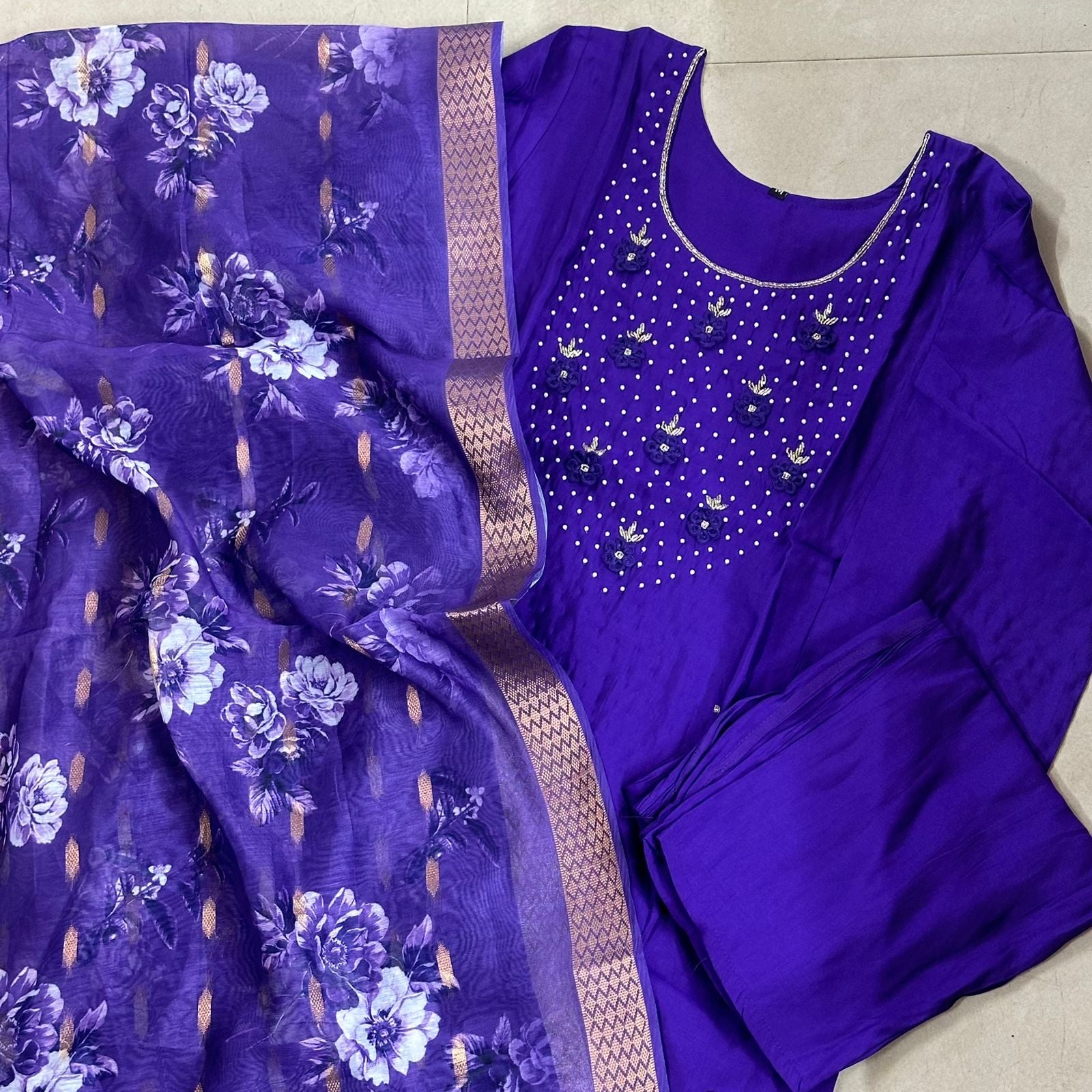 Pure Dola Silk Hand Embroidered Suit set- Purple