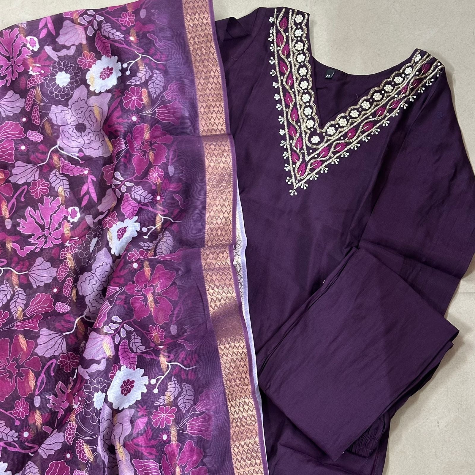 Pure Dola Silk Hand Embroidered Suit set- Purple