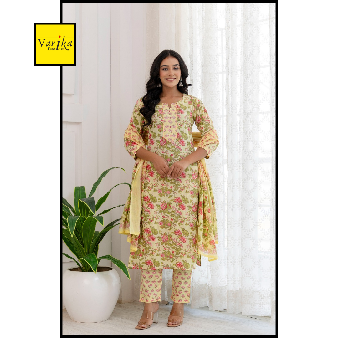 Sober and Sophiscated Yellow Jaipuri Printed Straight Suit Set with light embroidery on neck.