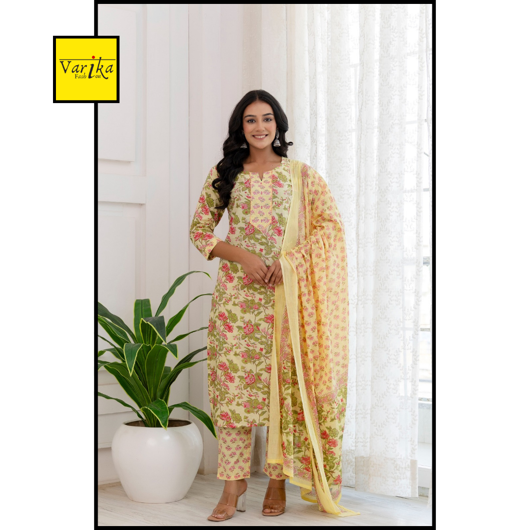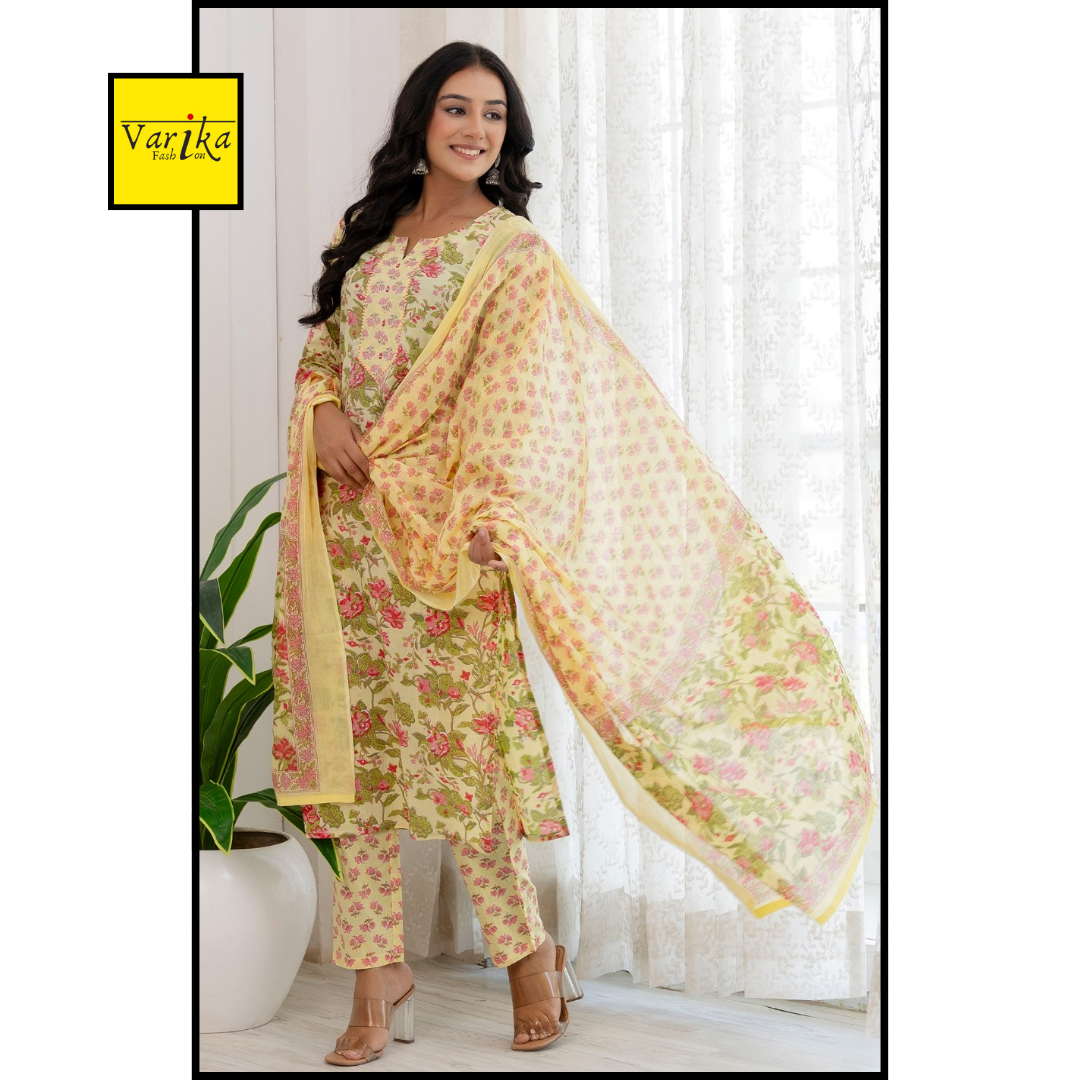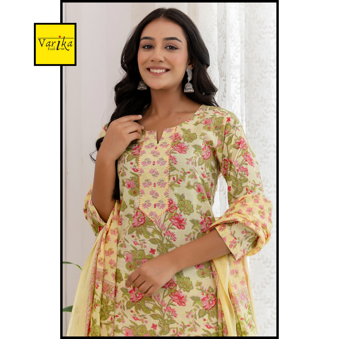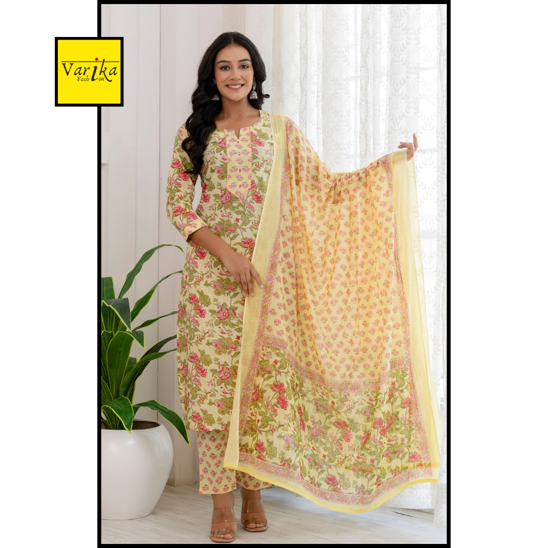 Yellow Jaipuri printed Straight Kurta set with light embroidery on the neck of the kurta. The pants are printed with trouser fit and the dupatta is printed in mul cotton fabric. The sleeves are 3/4th.