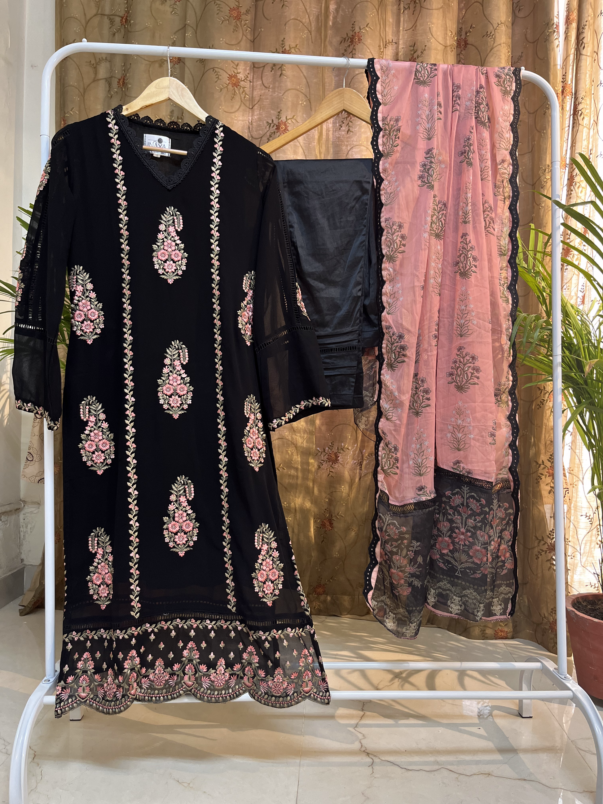 Dress to impress in this black Stitched Pakistani Suit. Made from viscose georgette fabric and finished with intricate thread embroidery, this suit is crafted to perfection. This elegant suit is teamed up with a satin stretchable pants and printed premium chiffon dupatta that adds to the graceful look of the outfit.
